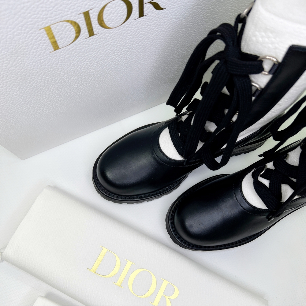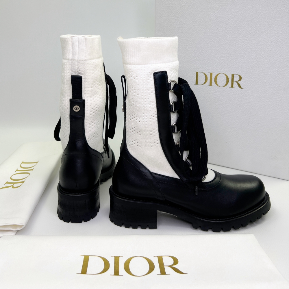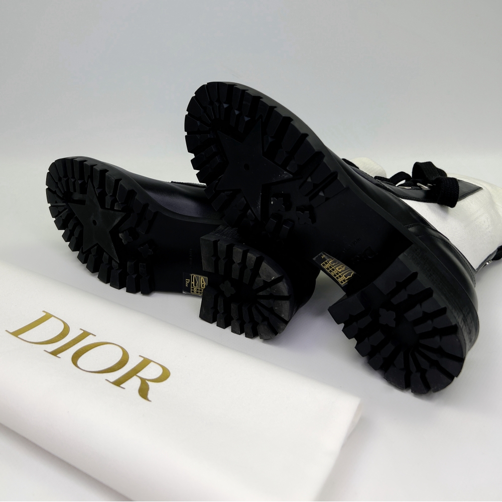 Контраст черной кожи и белого трикотажа создает эффект графичного минимализма, подчеркивая узнаваемый стиль Дома. Массивная рифленая подошва придает силуэту актуальность и комфорт, а черные широкие шнурки добавляют выразительности.