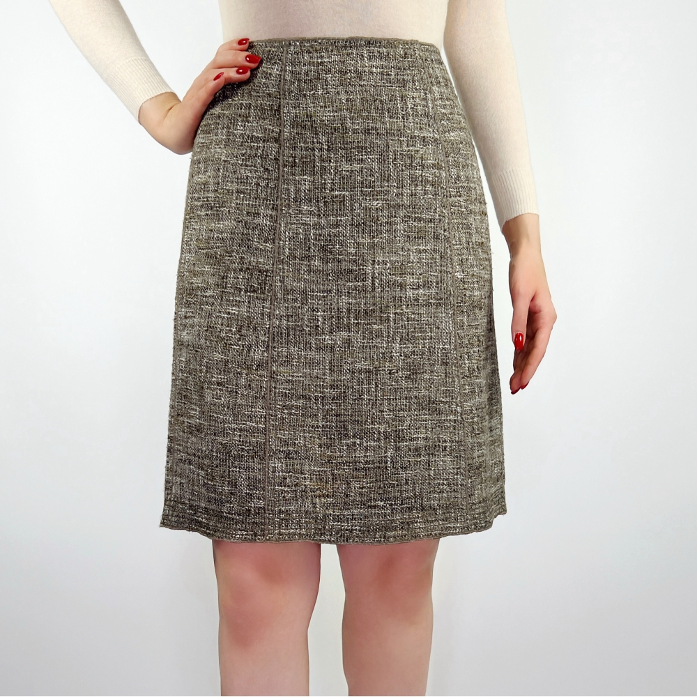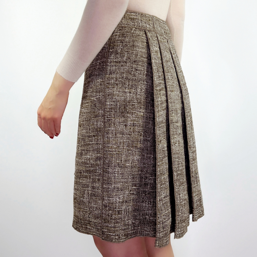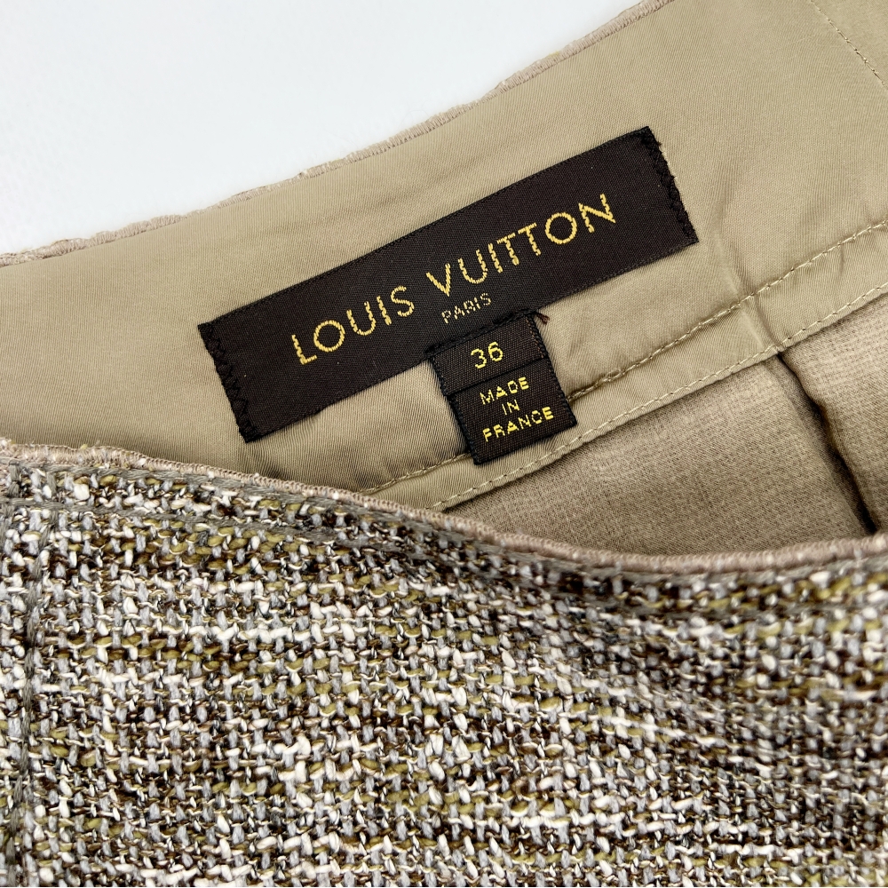 Элегантная юбка Louis Vuitton, созданная во Франции из благородного твида на основе шерсти, вискозы и подклада из шелка. Классический А-силуэт с акцентом на изысканную фактуру ткани и плиссированные вставки сзади создаёт утончённый силуэт и подчёркивает движение.