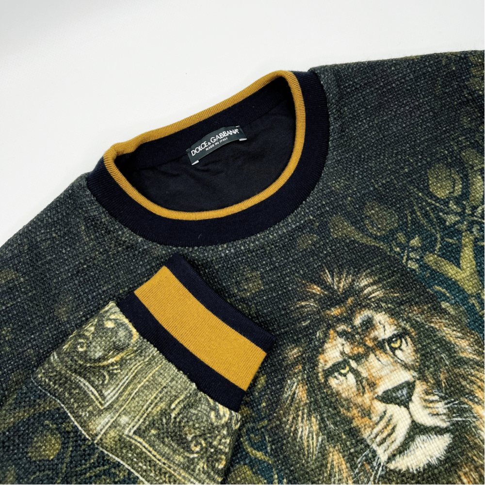 Выполнен из натуральной шерсти с подкладкой из хлопка. Эффектный принт с львом в мундире воплощает мощь и королевский характер — фирменный ироничный шик D&G.