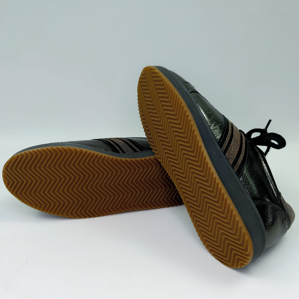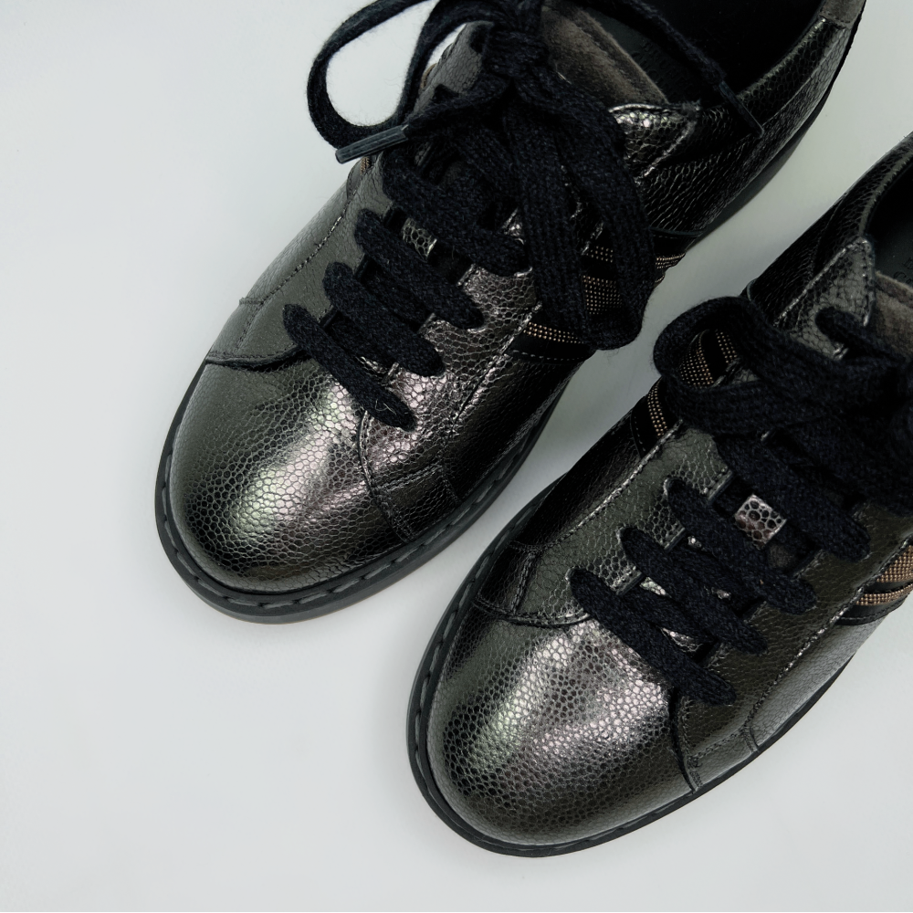 Металлизированный графитовый оттенок, акцентные вставки с фирменным декором монили и бархатистая замша на пятке — безупречный баланс комфорта и элегантности.