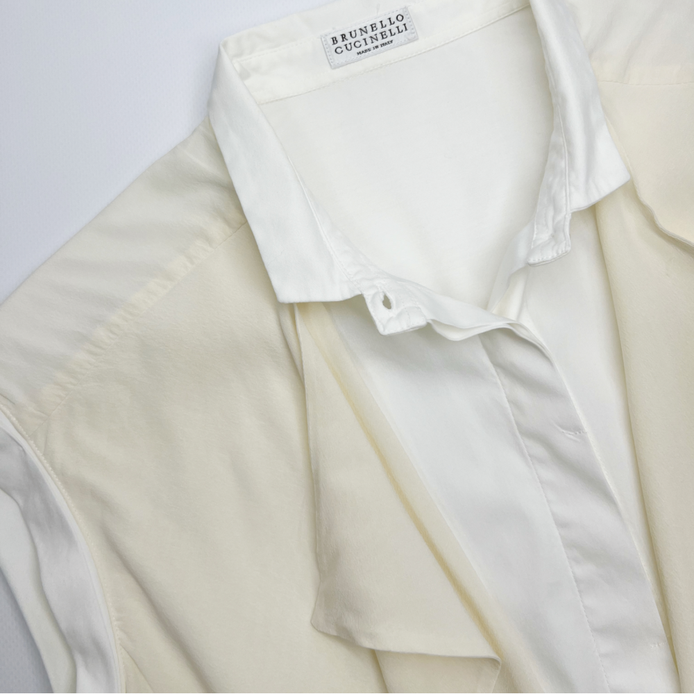Воплощение минимализма и утончённого итальянского кроя. Модель с комбинированной текстурой: база из хлопка и мягкий шелковый верх без рукавов создают многослойный эффект и идеально садятся по фигуре. Изысканная нейтральная палитра в духе тихая роскошь делает вещь универсальной для офисных и повседневных образов.