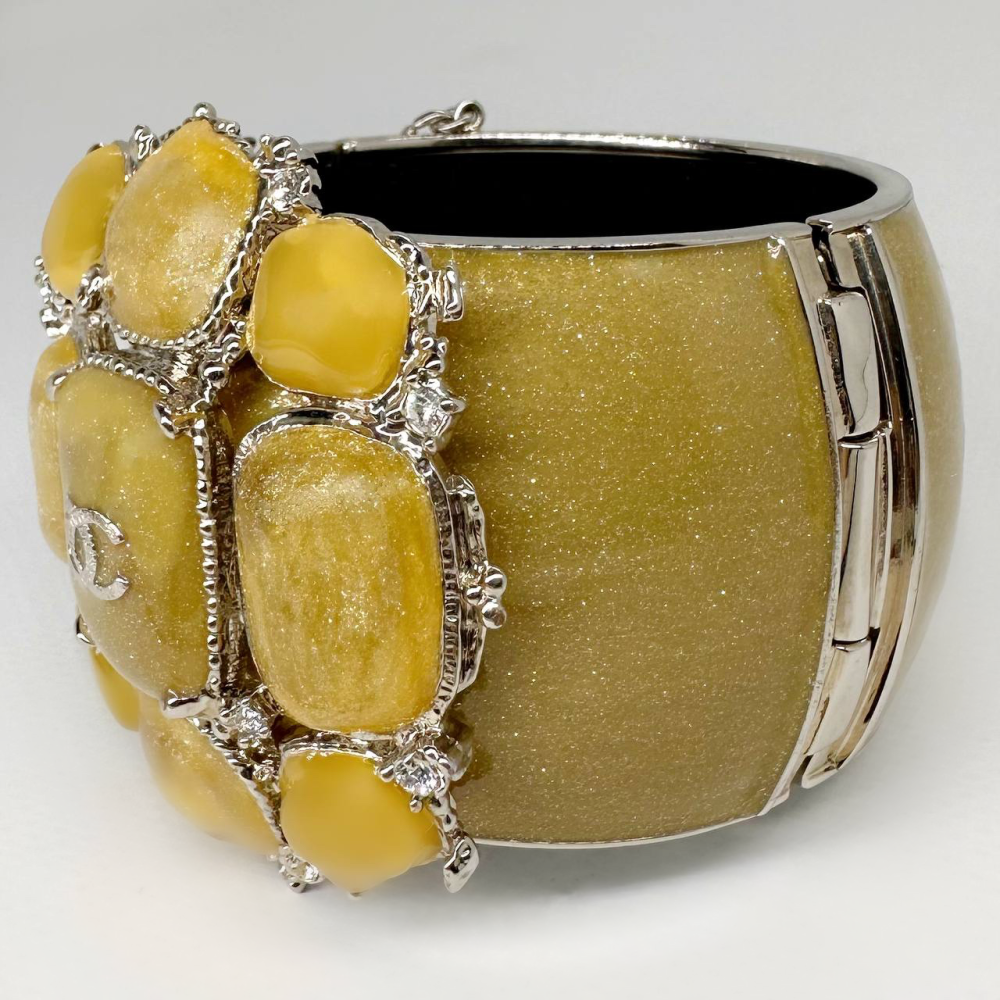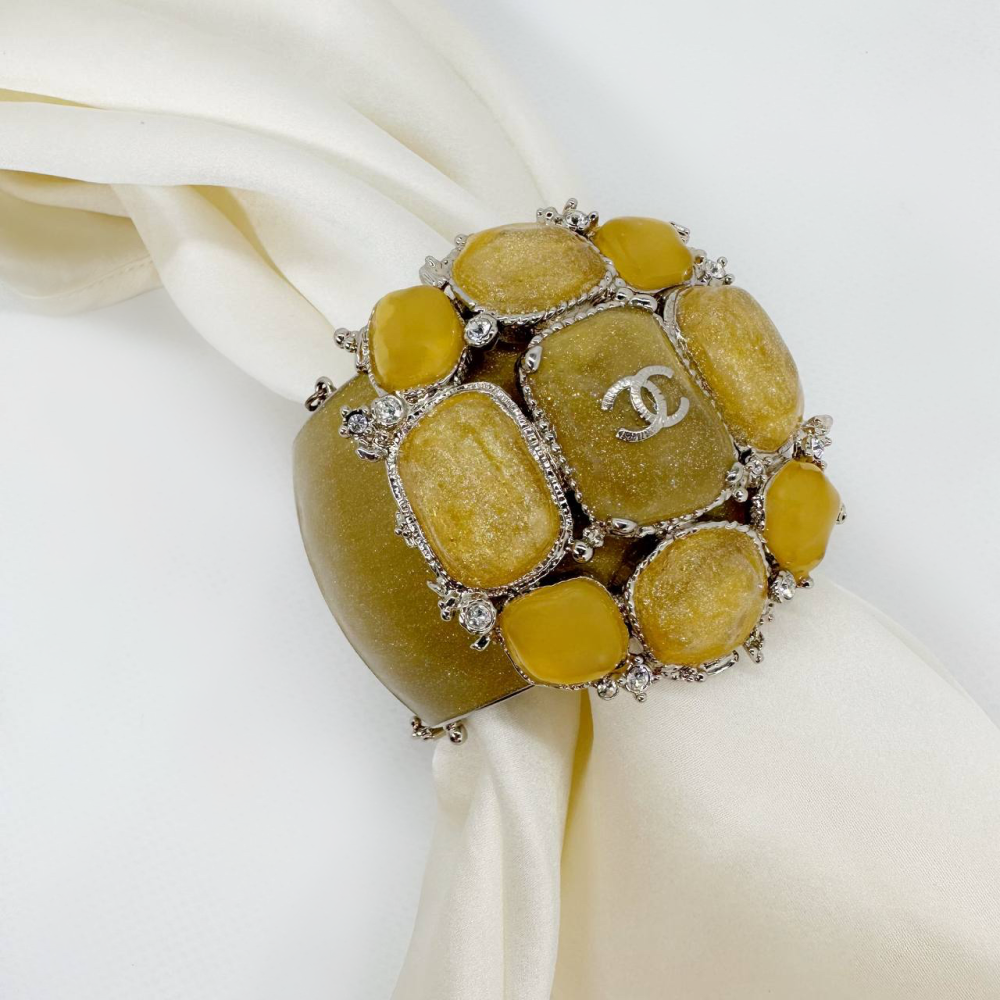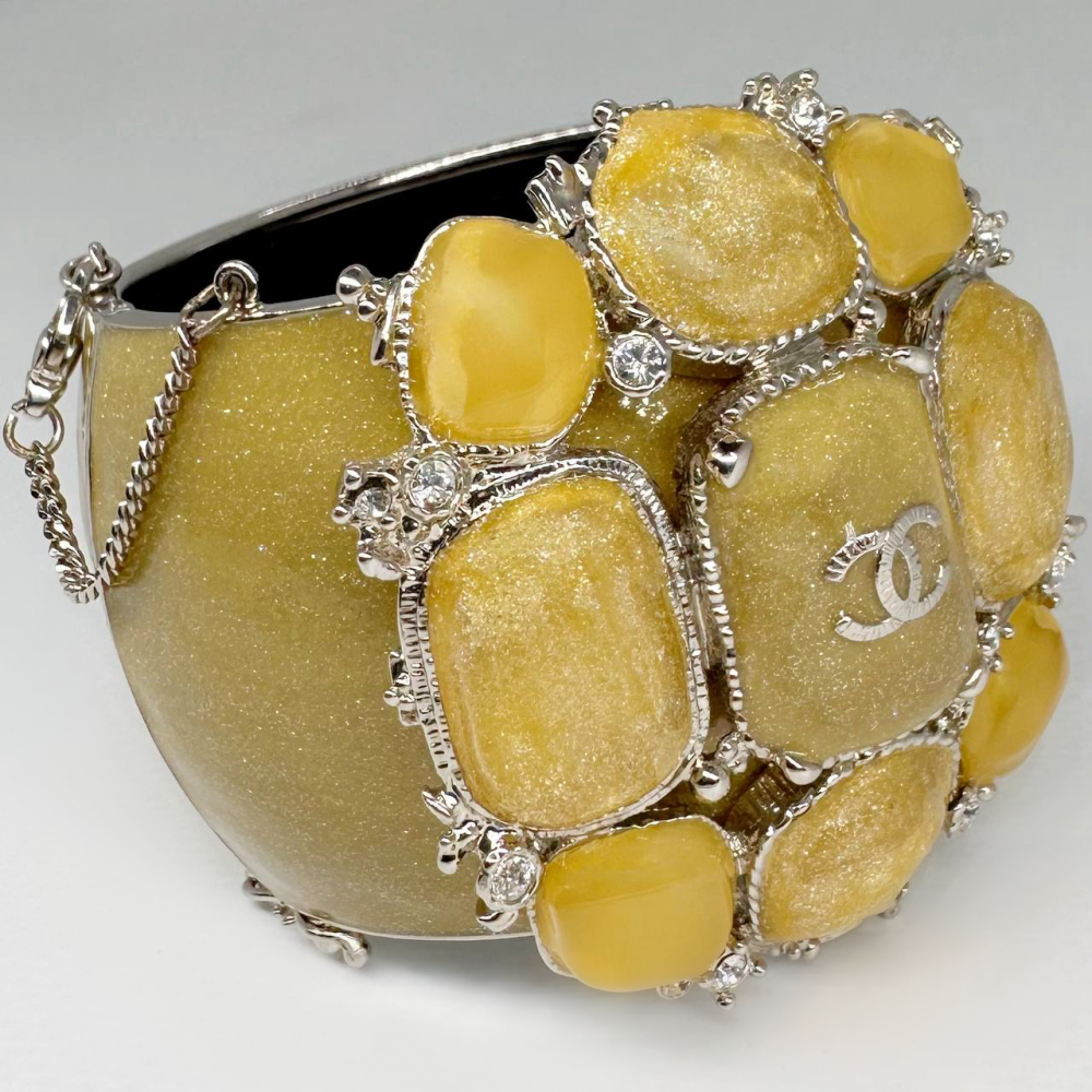 Объёмная форма, золотисто-жёлтые вставки с мерцающим эффектом и логотип CC в центре превращают украшение в арт-объект. Декорирован сияющими камнями и дополнен металлической оправой с защитной цепочкой.