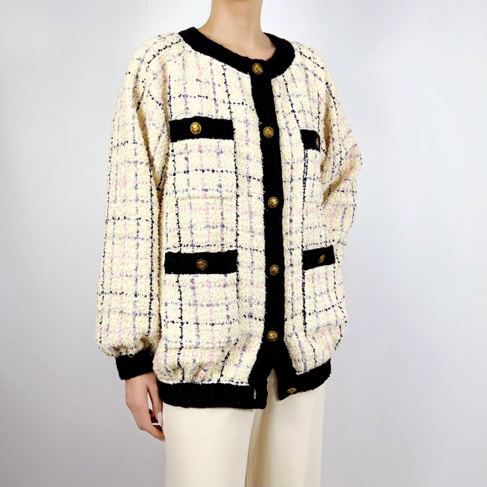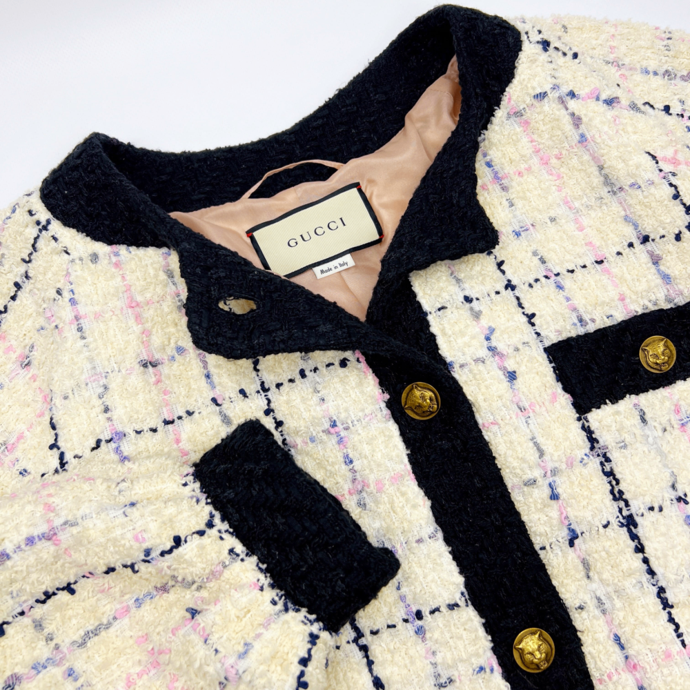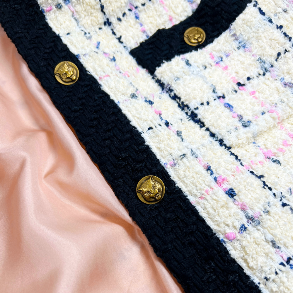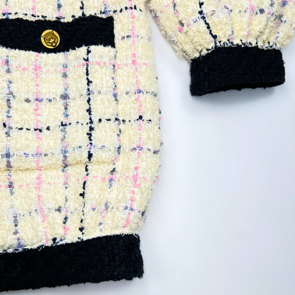Эффектный жакет из фактурного букле в оттенке айвори с акцентными розовыми и сиреневыми штрихами играет с мотивами культовой клетки. Подклад из 100% шёлка обеспечивает комфорт и благородную посадку. Модель гармонично сочетается как с элегантными брюками, так и с повседневными джинсами.