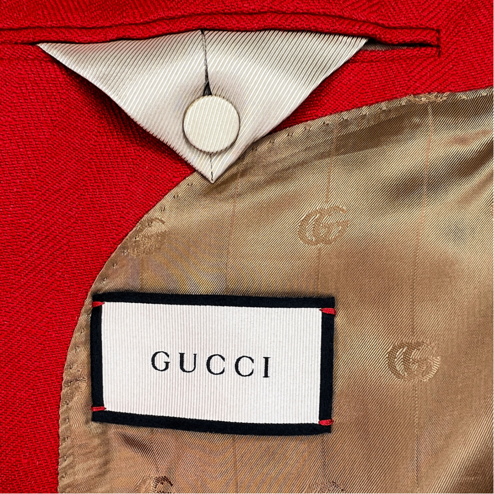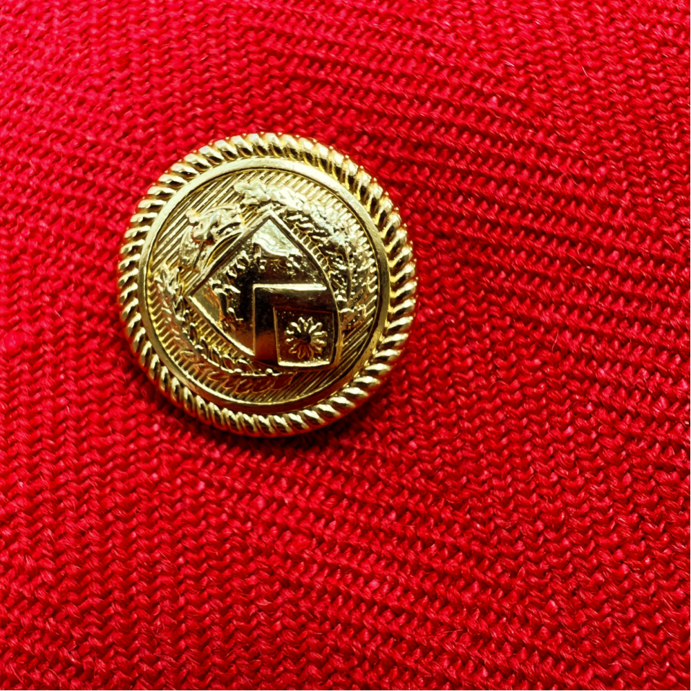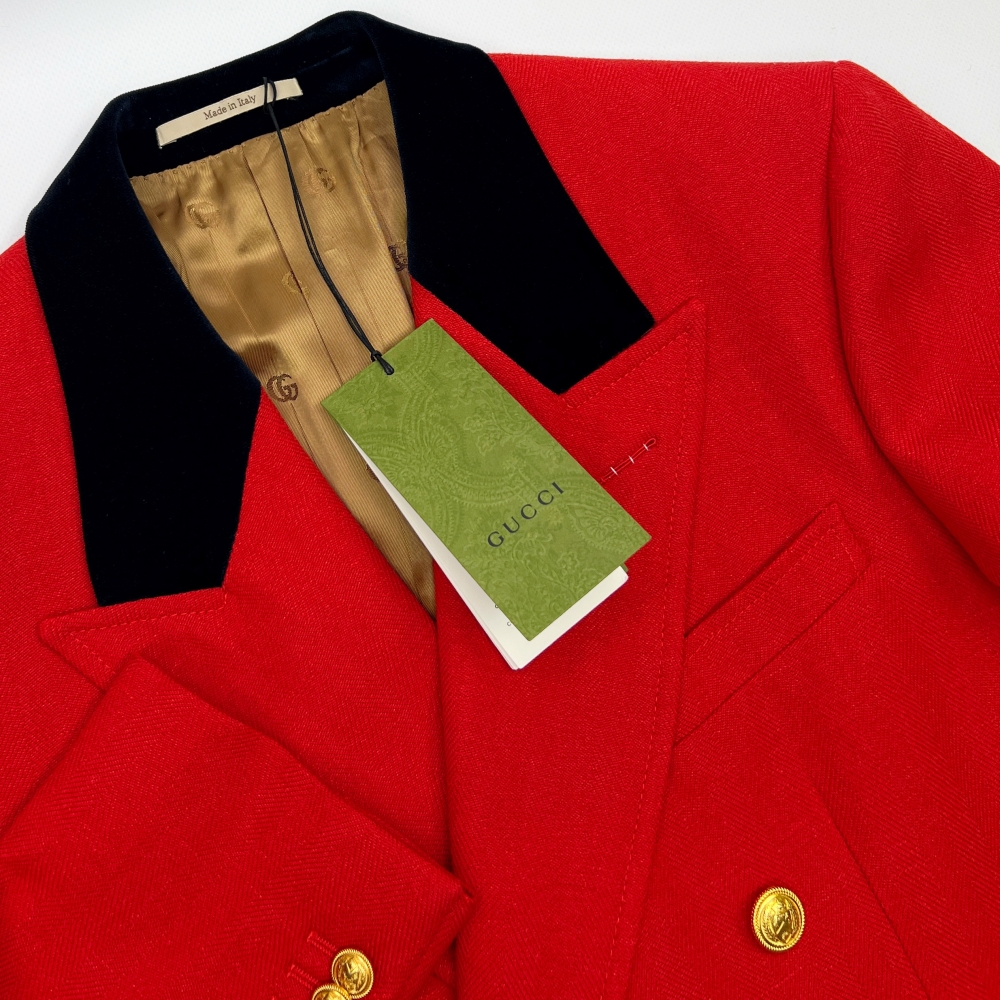 Двубортный крой в насыщенном красном оттенке подчеркнут контрастным бархатным воротником и золотыми пуговицами с фирменным тиснением. Высококачественный состав обеспечивает комфорт и благородную фактуру.