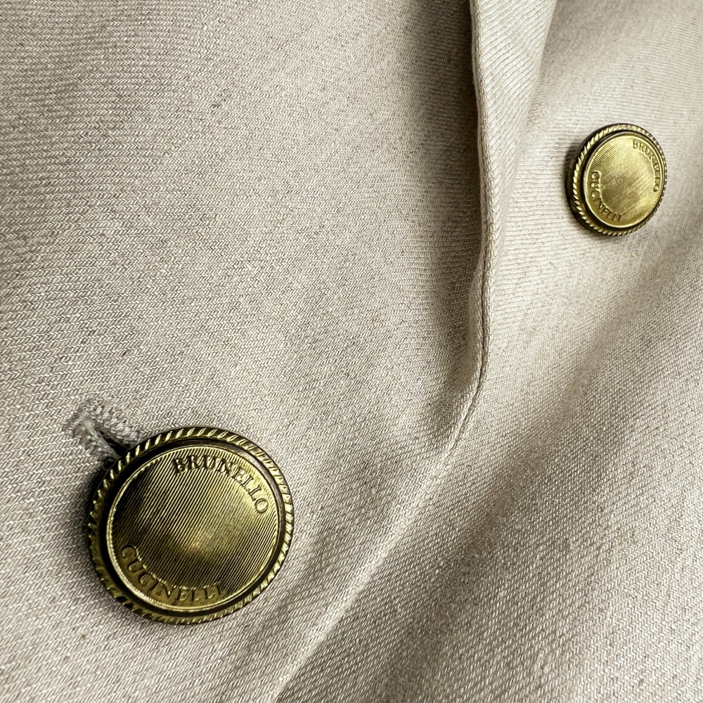 Бежевый жакет из тонкого льна с добавлением шёлка олицетворяет безупречный вкус и мастерство итальянского Дома Brunello Cucinelli. Прямой двубортный крой, подчёркнутый акцентными металлическими пуговицами, формирует строгую, но женственную линию плеч. Легкая, дышащая ткань делает модель идеальной для теплого сезона — как в офис, так и на ужин под открытым небом.