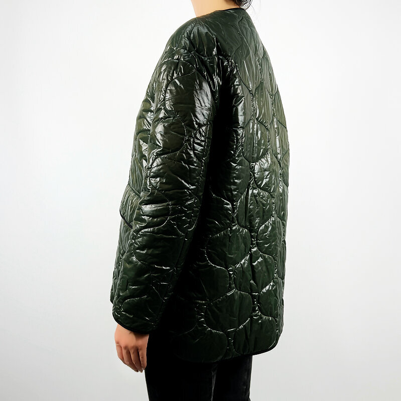 Выполнена в универсальном оттенке хаки — лёгкая, но тёплая модель с объемной стёжкой и аккуратной окантовкой в тон. Прямой силуэт и практичные накладные карманы делают его удобным для повседневной носки, а благородный блеск ткани добавляет нотку современного шика.