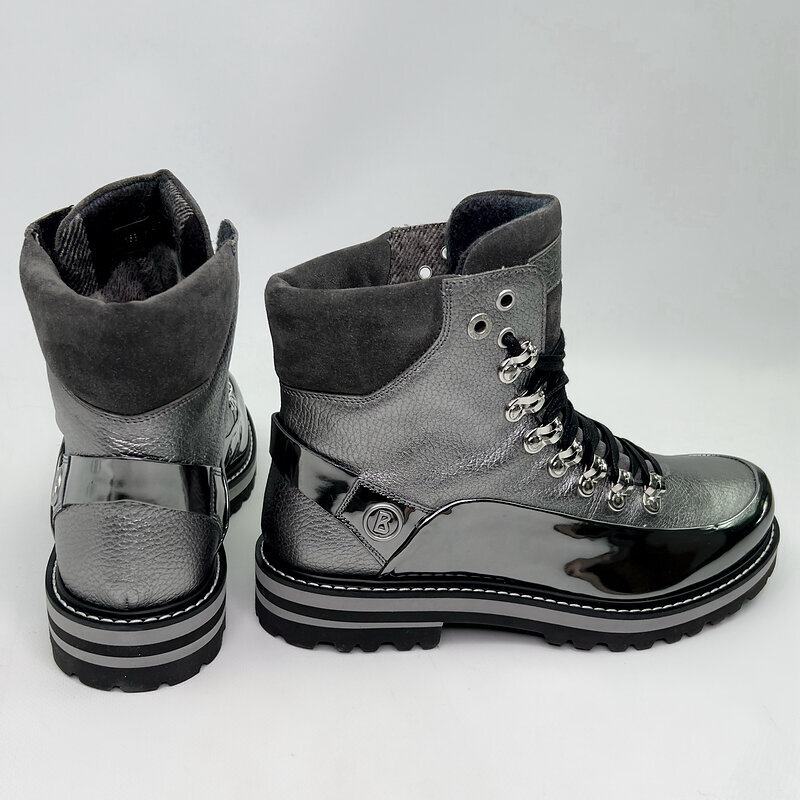 Модель выполнена из натуральной кожи с фактурной поверхностью и контрастными глянцевыми вставками, создающими эффект глубины и игры света. Металлическая фурнитура и массивная рифлёная подошва формируют характерный alpine-силуэт — функциональный и одновременно урбанистичный.
