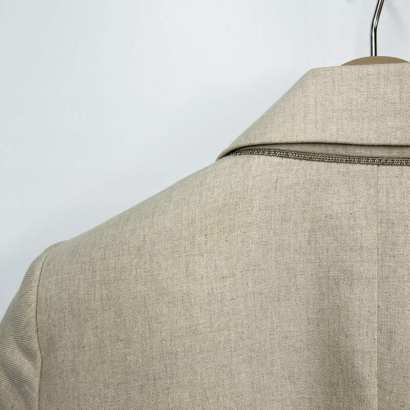 Бежевый жакет из тонкого льна с добавлением шёлка олицетворяет безупречный вкус и мастерство итальянского Дома Brunello Cucinelli. Прямой двубортный крой, подчёркнутый акцентными металлическими пуговицами, формирует строгую, но женственную линию плеч. Легкая, дышащая ткань делает модель идеальной для теплого сезона — как в офис, так и на ужин под открытым небом.