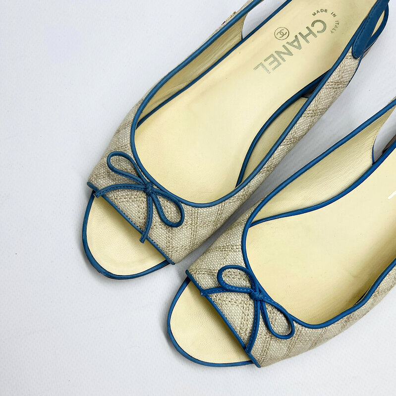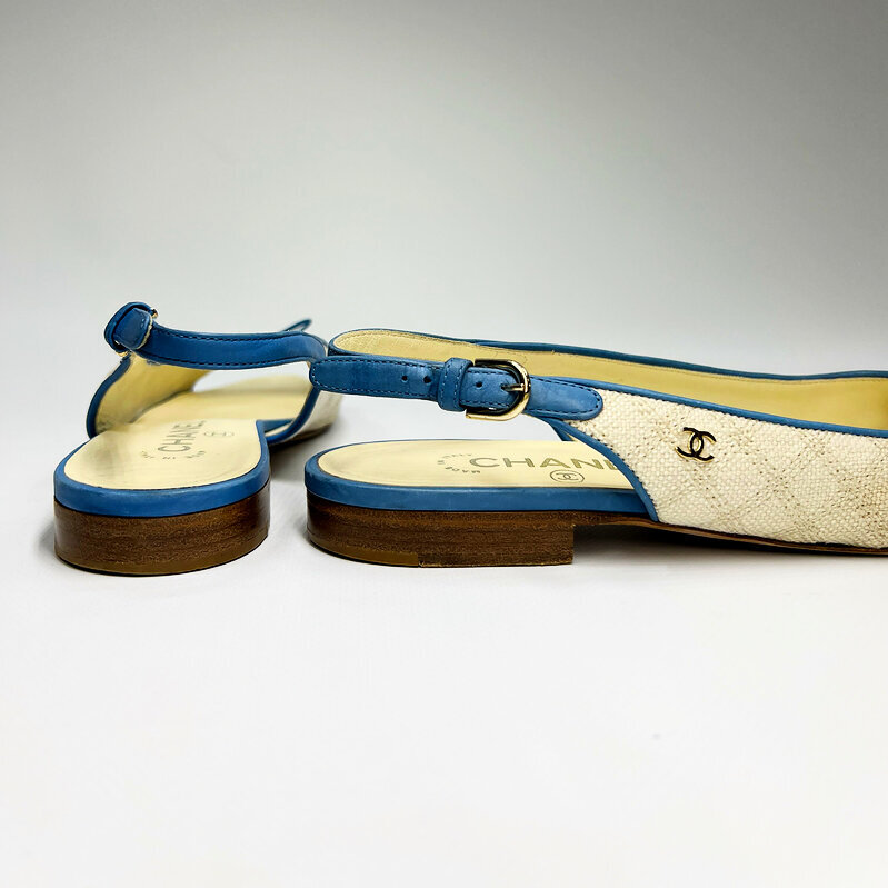 Лёгкие летние слингбэки в духе Ривьеры сочетают две культовые «визитки» Дома Chanel — фактурный твид и фирменную отделку в виде миниатюрного банта. Кремовый твид с деликатной стёжкой подчеркнут небесно-голубой окантовкой из мягкой кожи и регулируемым ремешком на щиколотке. Небольшой открытый мысок визуально вытягивает стопу, а серебристая эмблема CC сбоку расставляет узнаваемый акцент. Мягкая кожаная подошва и стелька обеспечивают комфорт на весь день.