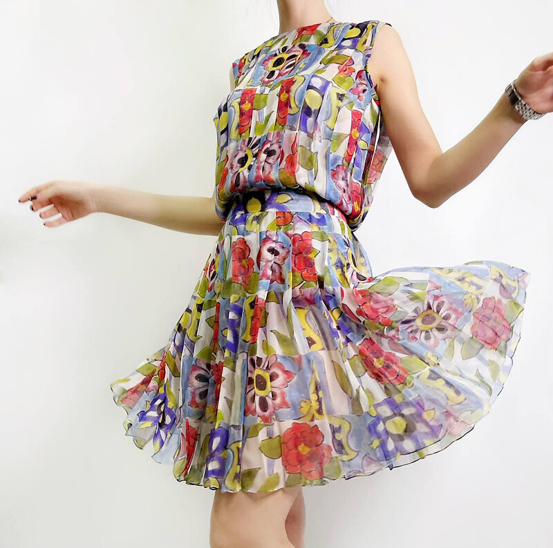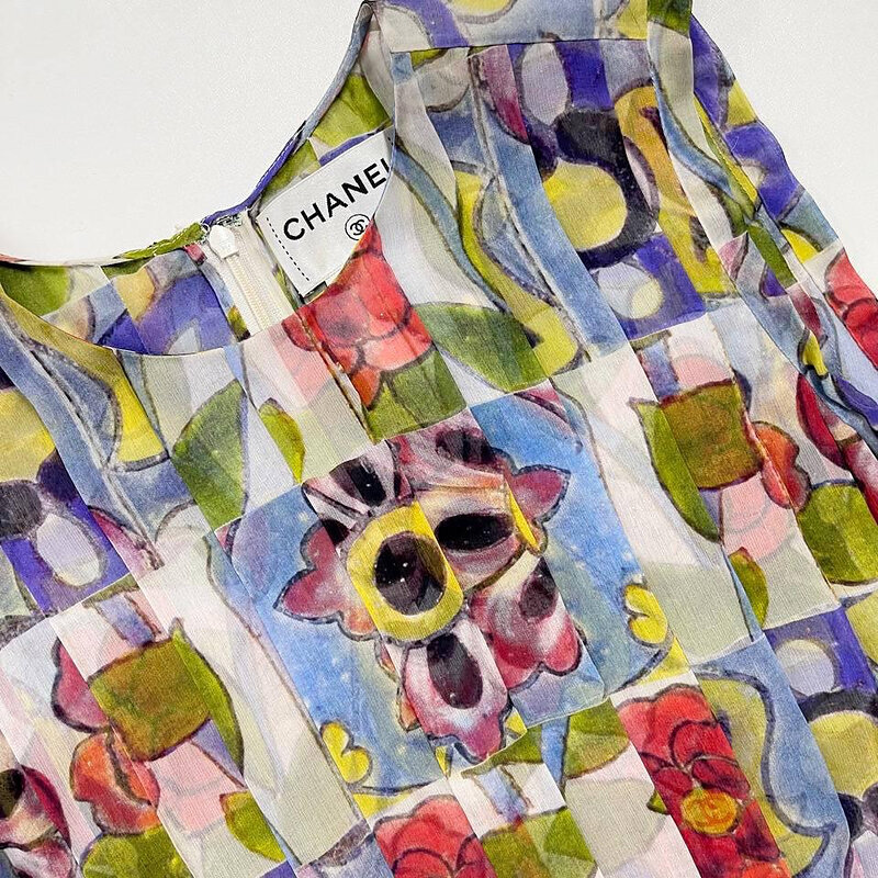 Легкое шифоновое мини, будто собранное из акварельных витражей: на полупрозрачном шелке расцветает мозаика из маков, подсолнухов и лилий в оттенках фуксии, ириса и оливкового лайма. Свободный лиф со сборкой «блузон» мягко драпируется по талии, а солнце-плиссе юбки играет при каждом шаге, создавая воздушный вихрь цвета. Ненавязчивая изысканность Chanel — ни одной лишней детали, лишь идеальная посадка и богатый принт.