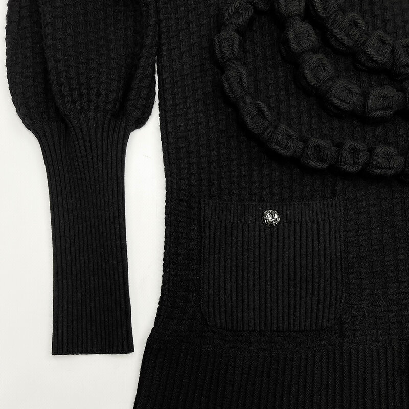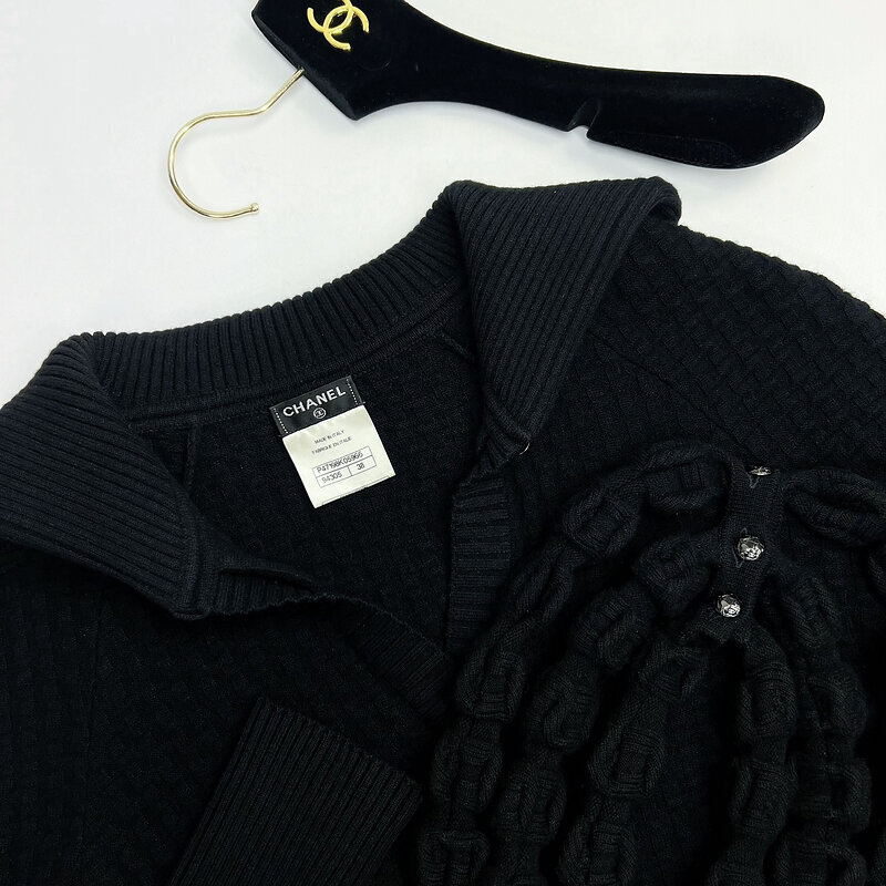 Современная интерпретация культовой классики. Фактурный узор подчеркивает лаконичный силуэт, объемные рукава создают игру пропорций, а фирменные пуговицы с логотипом на накладных карманах добавляют акцент. Модель дополнена воротником-поло и комплектуется объемным вязаным украшением, которое можно носить отдельно или вместе для более выразительного образа.