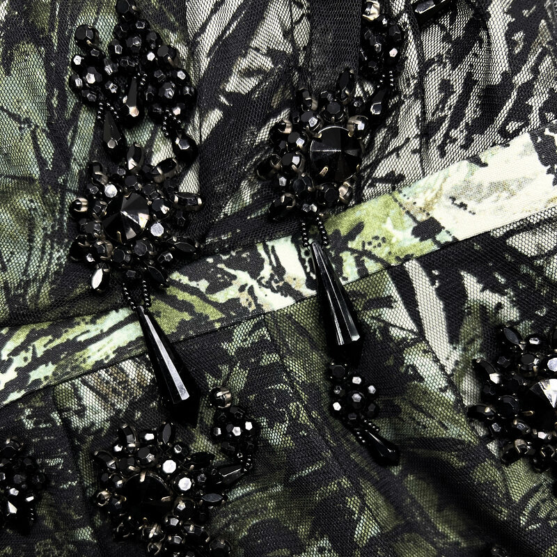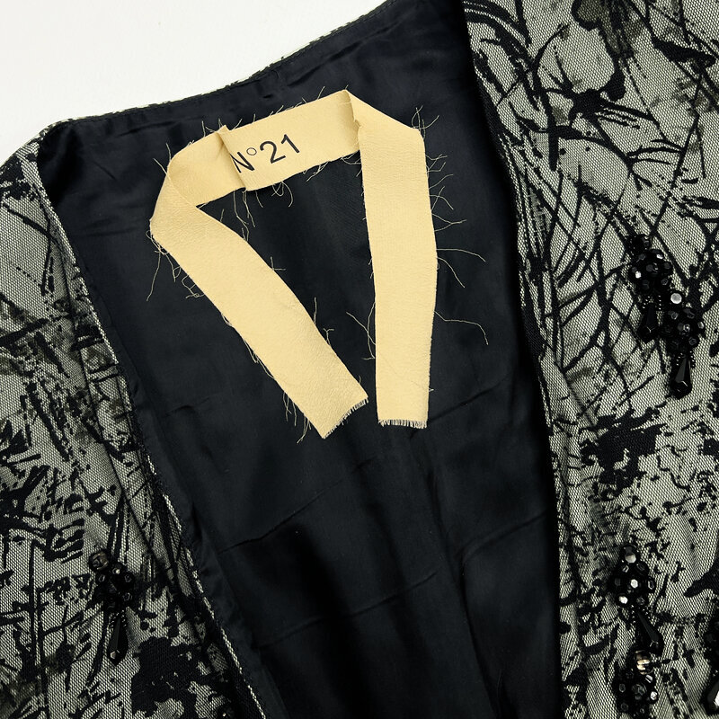 Эффектное коктейльное платье от N°21 с выразительным силуэтом. Модель выполнена из шёлка с художественным принтом в тёмно-зелёной гамме, дополнена деликатной вышивкой бисером и акцентной линией талии. Глубокий вырез подчёркивает фигуру, создавая баланс между смелостью и элегантностью — фирменный почерк бренда.