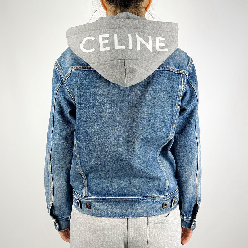 Стильная джинсовая куртка Celine с интегрированным капюшоном — эффектная интерпретация культовой деним-классики французского дома. Модель сочетает структурированную джинсовую основу и мягкий трикотажный капюшон с крупным логотипом CELINE, создавая современный многослойный силуэт.