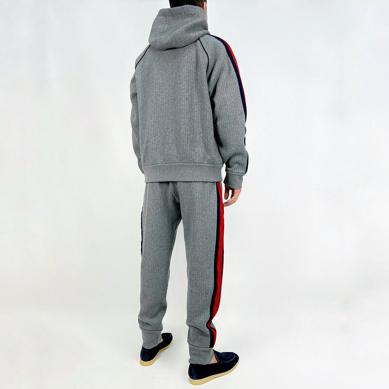 Модель выполнена из мягкого смесового трикотажа на основе кашемира и шерсти, что обеспечивает тепло, пластичность и приятные тактильные ощущения. Лаконичный серый оттенок подчёркнут фирменными контрастными лампасами, создающими динамичный, но сдержанный образ.