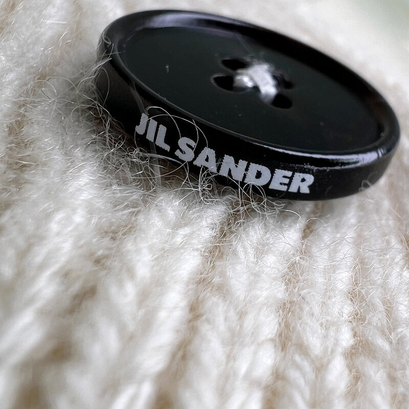 Минималистичный силуэт в оттенке молочного айвори — воплощение тихой роскоши и идеального кроя от Jil Sander. Контрастные пуговицы с логотипом придают образу графичность.