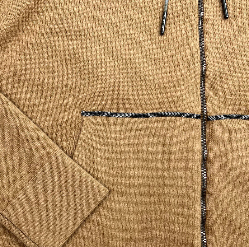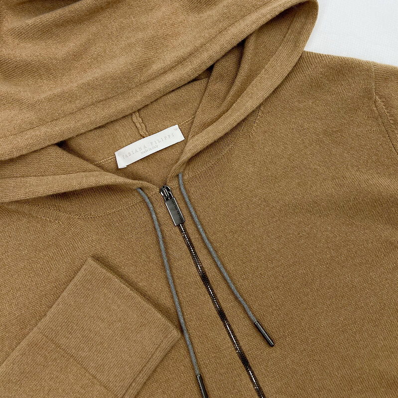 Верх — худи на молнии с капюшоном и деликатной фирменной отделкой.