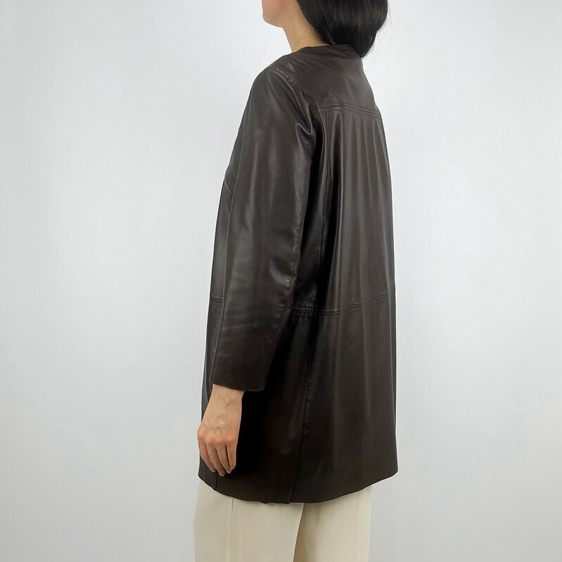 Кожаный плащ Max Mara — элегантная интерпретация классического тренча в благородном тёмно-коричневом оттенке.