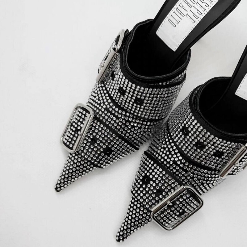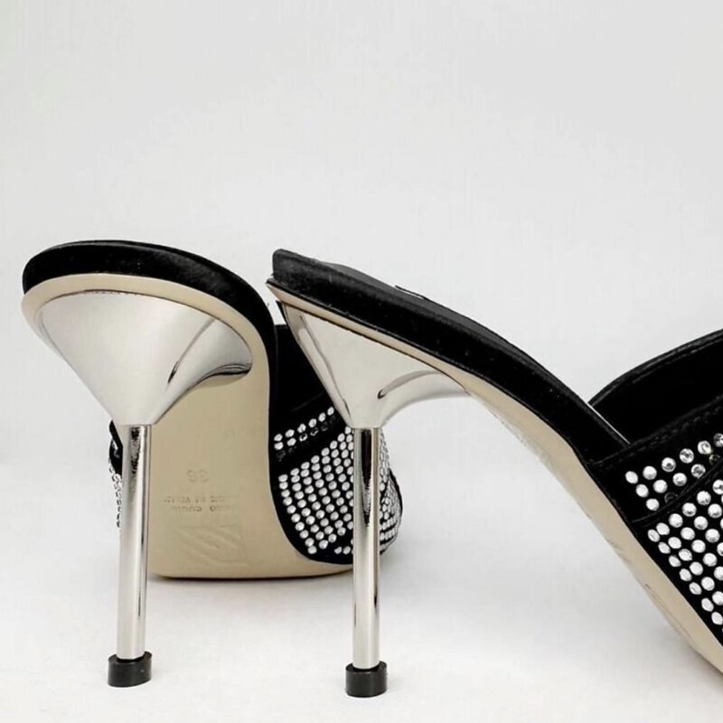Эти мюли Giuseppe Di Morabito — чистая концентрация вечернего настроения. Силуэт с острым носом и тонкой шпилькой визуально вытягивает линию ноги, а полностью инкрустированная кристаллами поверхность создаёт эффект сияния при каждом движении.