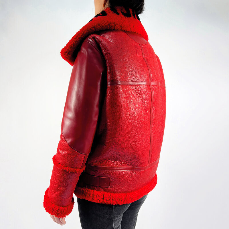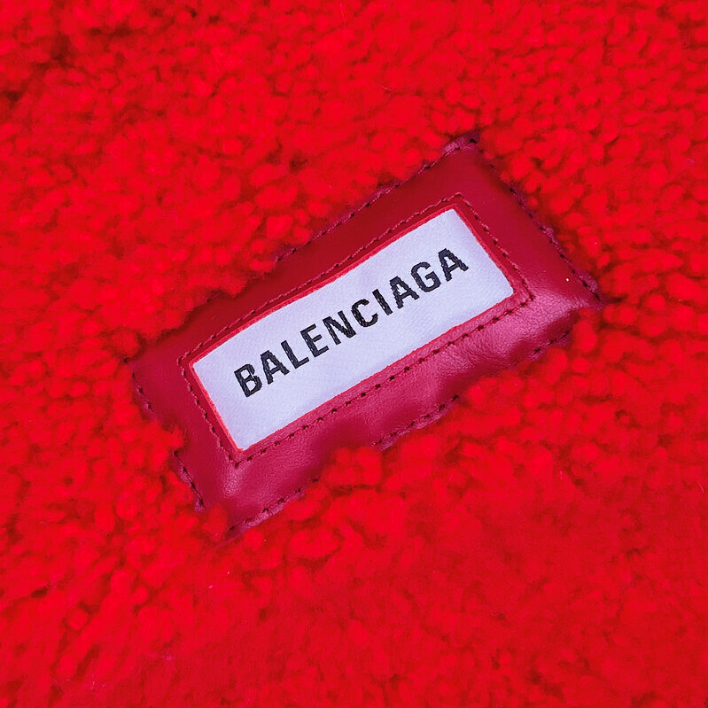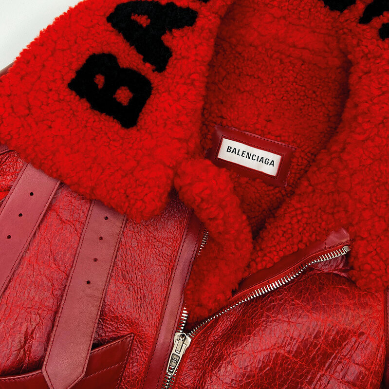 Культовая красная дублёнка из овчины — насыщенный красный цвет, фирменный объёмный крой бренда и тёплый фактурный мех внутри. Массивный воротник с логотипом BALENCIAGA создаёт яркий акцент, а продуманные кожаные ремни и детали подчёркивают премиальность модели.