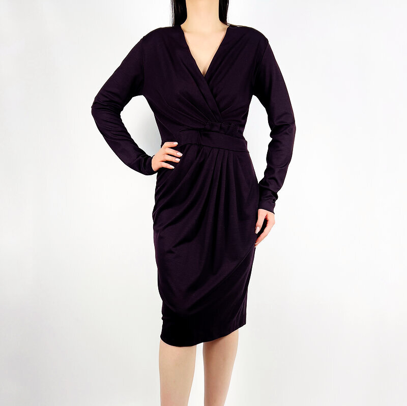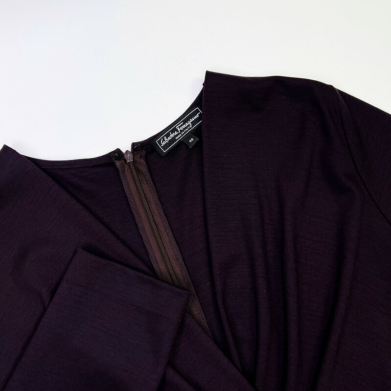 Элегантное женское платье от Salvatore Ferragamo в благородном фиолетовом оттенке. Классический крой с акцентом на талию, мягкая драпировка и V-образный вырез подчёркивают силуэт и создают утончённый, женственный образ.