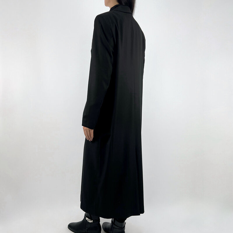 Материал из тонкой шерсти и подклада вискозы даёт плотную, «собранную» фактуру: ткань мягко ложится по фигуре, держит форму и создаёт ощущение структурированной элегантности. Глубокий чёрный цвет усиливает эффект — универсальный, строгий и максимально статусный.