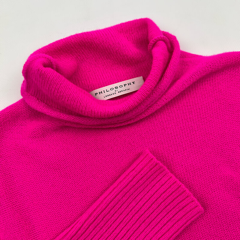 Платье выполнено из 100% шерсти в сочном оттенке фуксии — цвет, который не остаётся незамеченным. Модель миди с высоким воротником и акцентной линией плеч формирует сильный силуэт и подчёркивает талию.