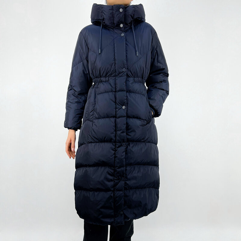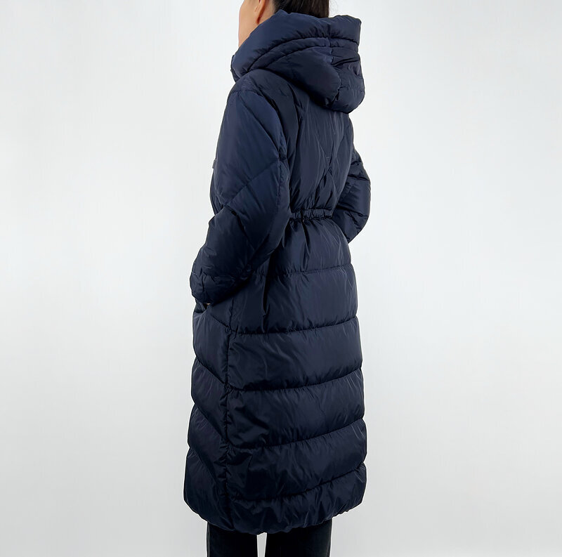Акцент на талии за счёт внутренней кулиски формирует аккуратную посадку, сохраняя свободу движения. Объёмный капюшон и высокий воротник защищают от ветра, а наполнитель пух/перо обеспечивает комфорт даже в морозную погоду.