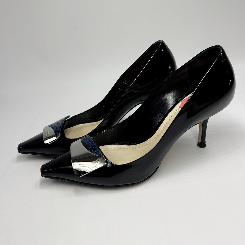 Гладкая лакированная кожа в глубоком чёрном оттенке усиливает архитектурность формы, а контрастная вставка с текстурой и металлическим элементом добавляет характер и современное звучание. Это тот случай, когда классика приобретает модный акцент, оставаясь вне времени.