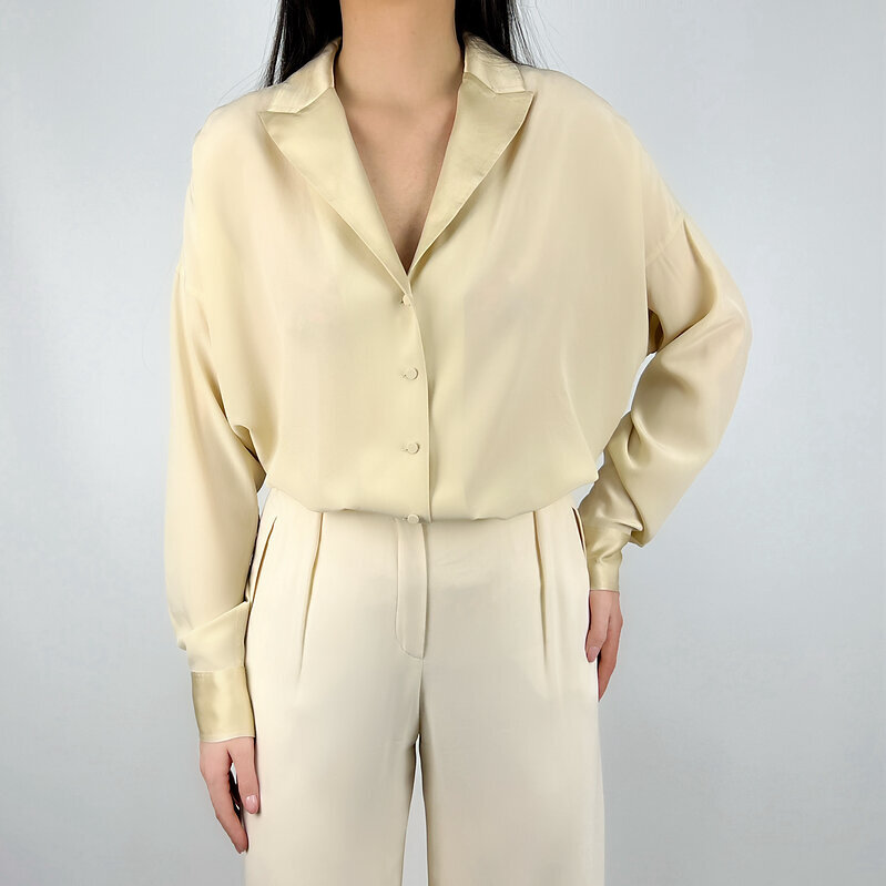 Лаконичная блуза из натурального шёлка в мягком бежевом оттенке. Свободный oversize-крой красиво драпируется и создаёт расслабленный, но собранный силуэт. Аккуратный воротник, застёжка на пуговицы и длинный рукав делают модель универсальной — от дневных образов до вечерних сочетаний.