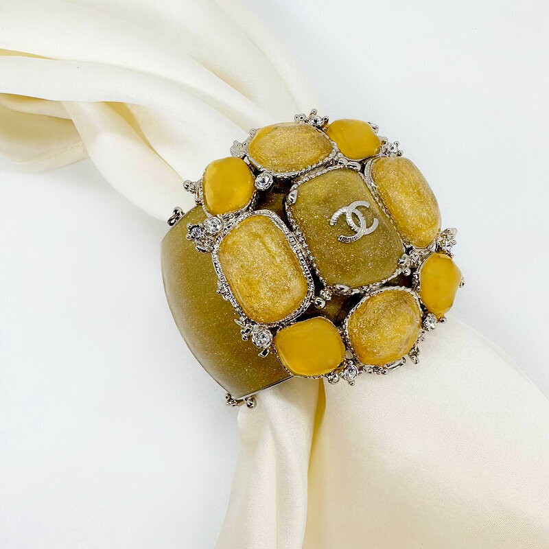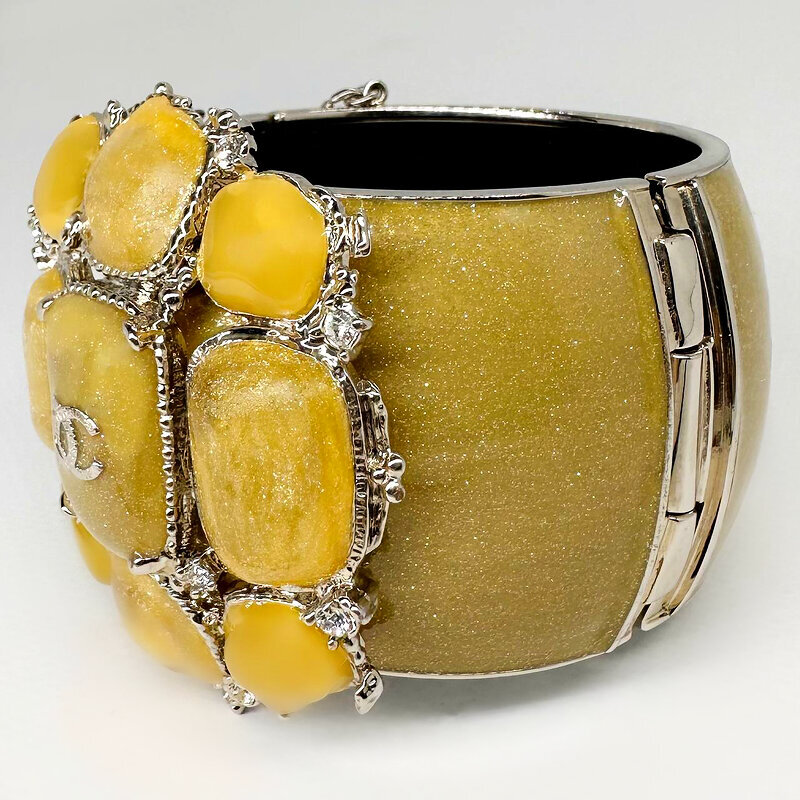 Объёмная форма, золотисто-жёлтые вставки с мерцающим эффектом и логотип CC в центре превращают украшение в арт-объект. Декорирован сияющими камнями и дополнен металлической оправой с защитной цепочкой.