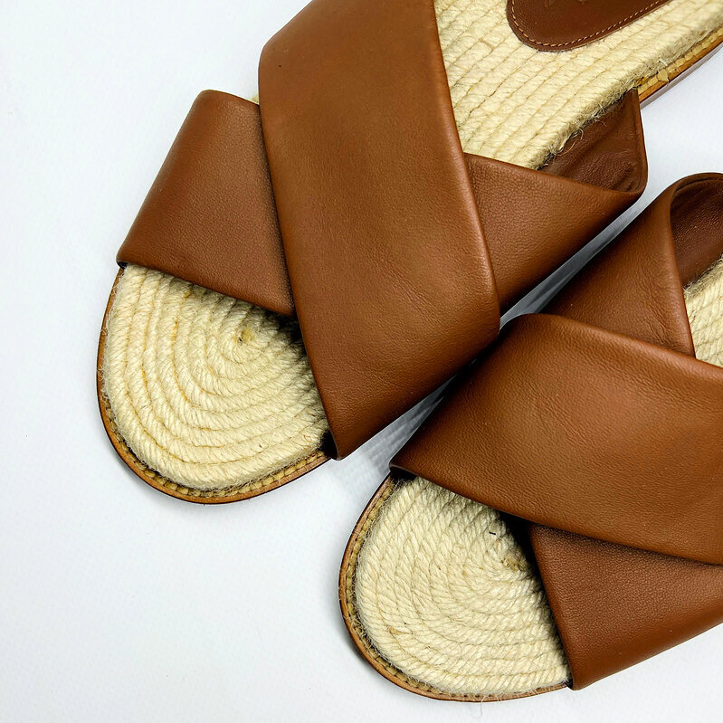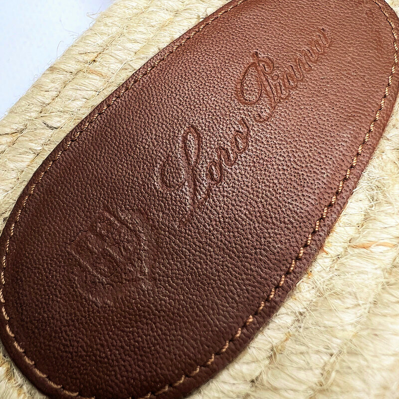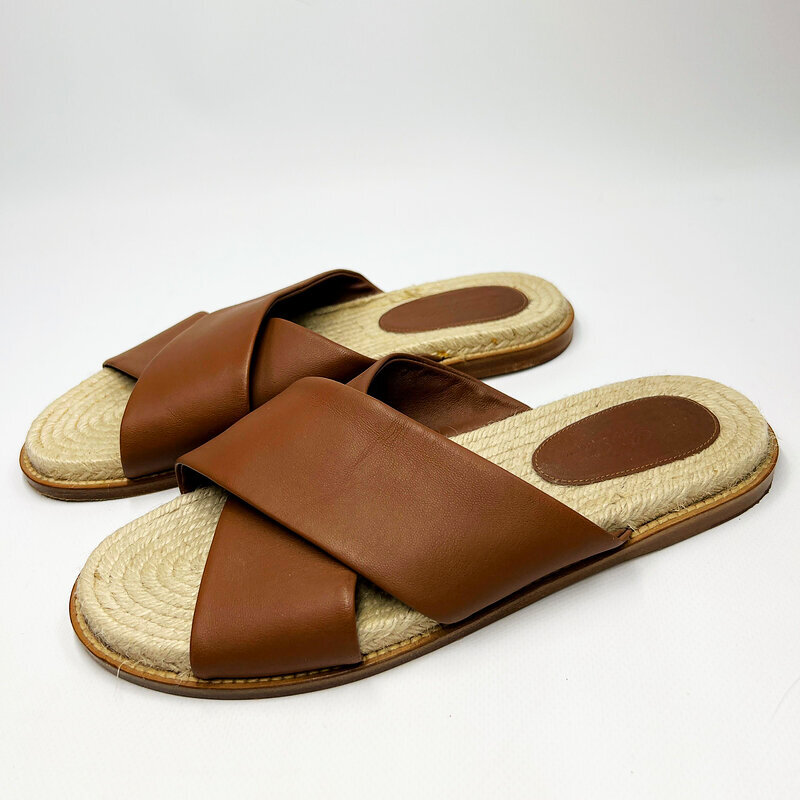 Лаконичные шлёпанцы Loro Piana: широкие перекрёстные ремни из мягкой коньячной кожи, дышащая джутовая стелька в стиле эспадрилий и кожаная вставка с тиснённым логотипом. Лёгкая, естественная палитра и премиальные материалы делают пару идеальным спутником летних прогулок в городе и на курорте.
