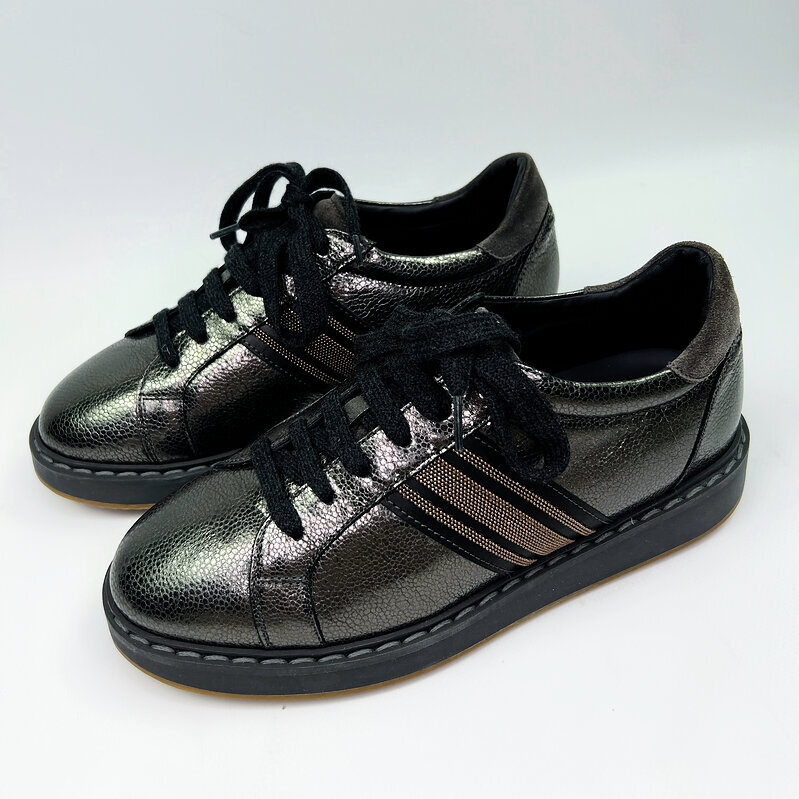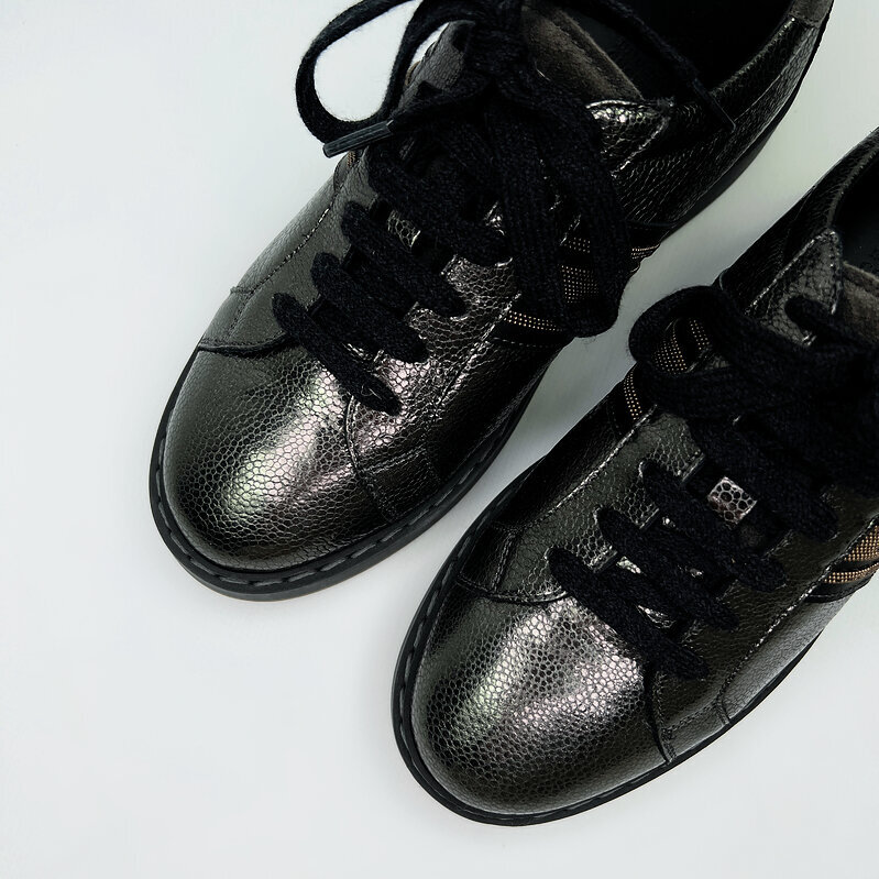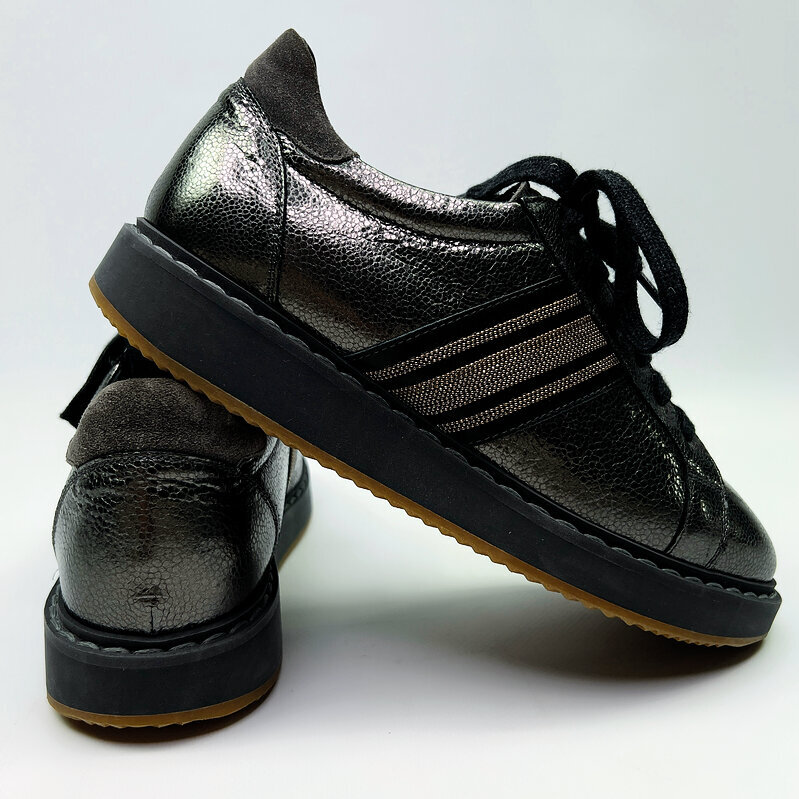 Металлизированный графитовый оттенок, акцентные вставки с фирменным декором монили и бархатистая замша на пятке — безупречный баланс комфорта и элегантности.