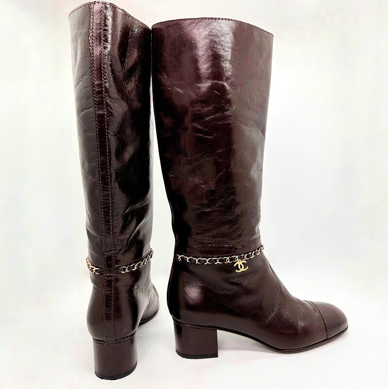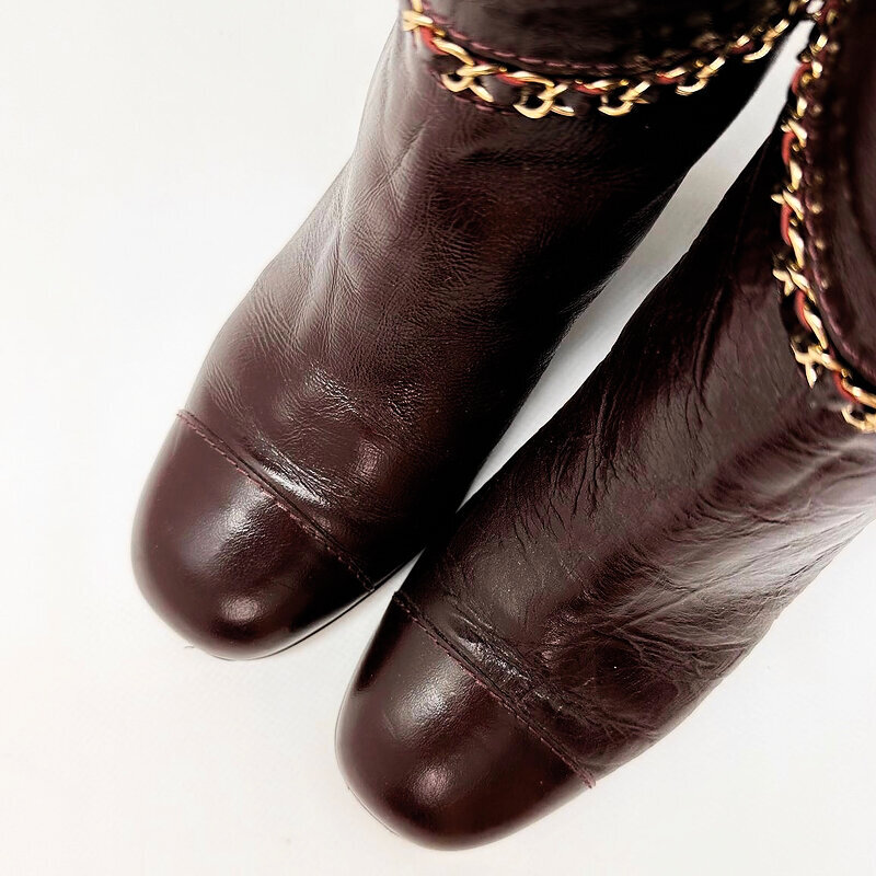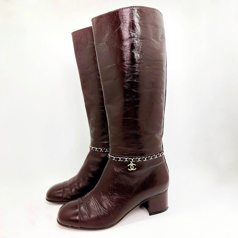 • Классическая модель из натуральной кожи глубокого бордового оттенка. Лаконичный силуэт дополнен изящным акцентом — цепочкой с фирменным логотипом CC, которая подчёркивает узнаваемый код Chanel. Универсальная форма и устойчивый каблук делают сапоги идеальными для городского гардероба — от деловых образов до вечерних выходов.