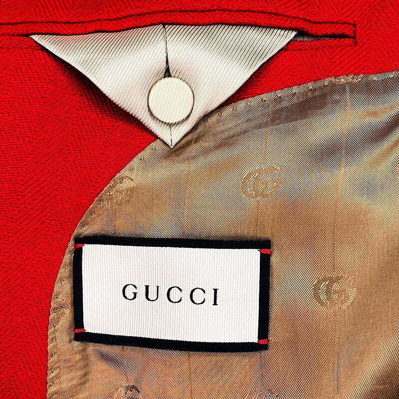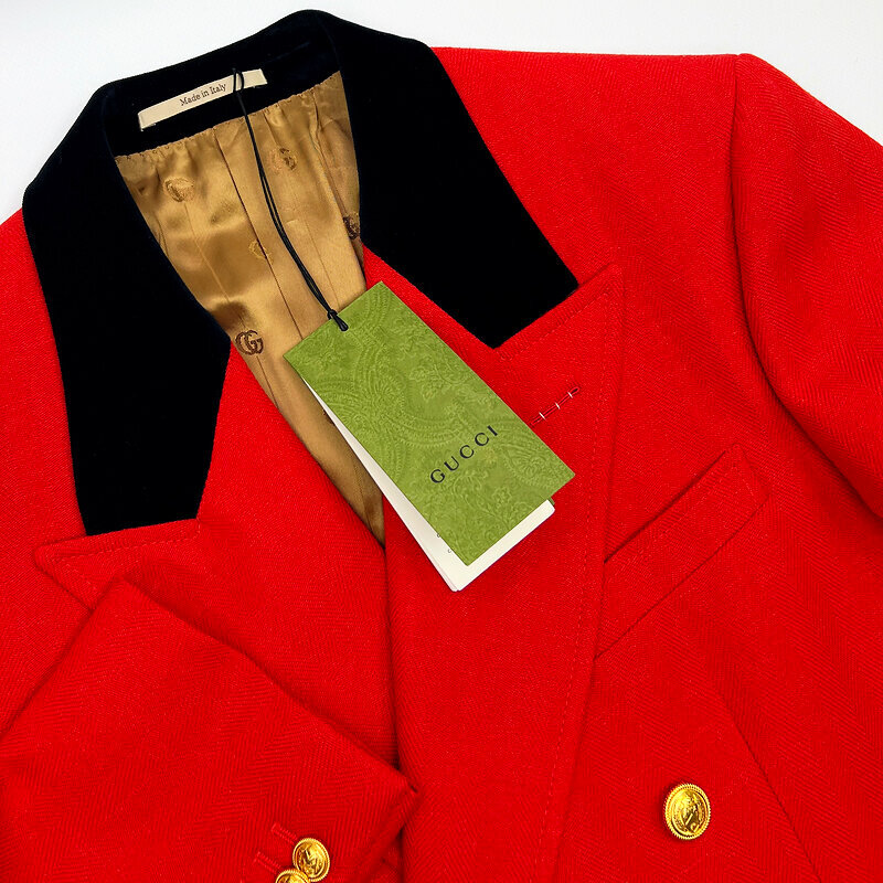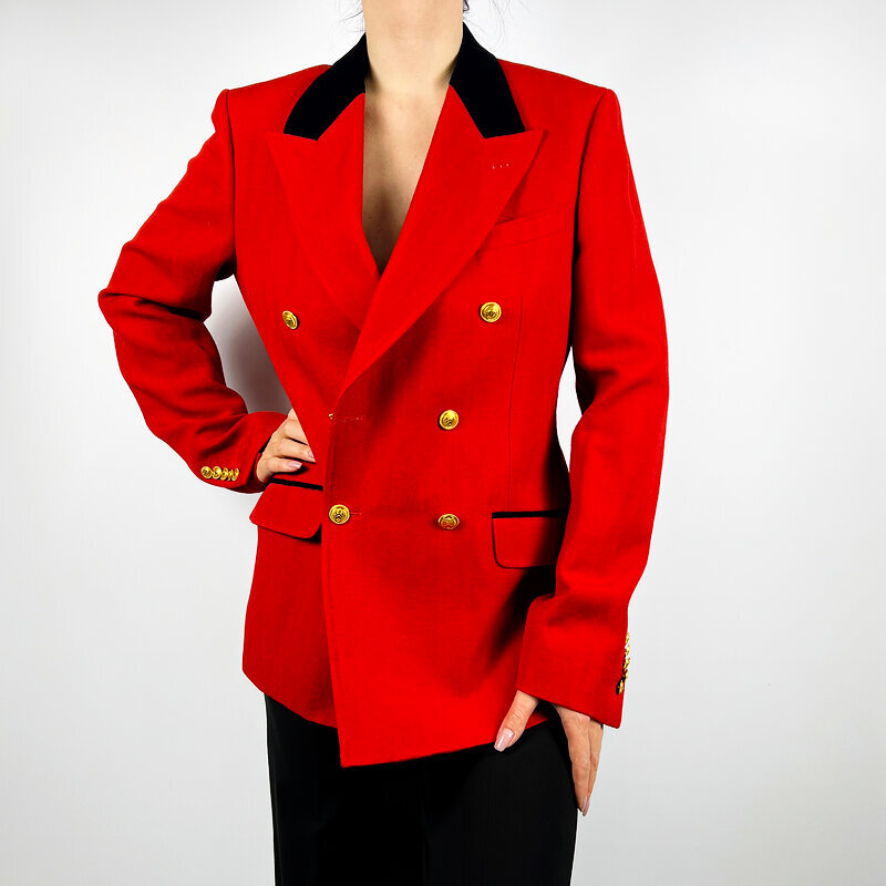 Двубортный крой в насыщенном красном оттенке подчеркнут контрастным бархатным воротником и золотыми пуговицами с фирменным тиснением. Высококачественный состав обеспечивает комфорт и благородную фактуру.