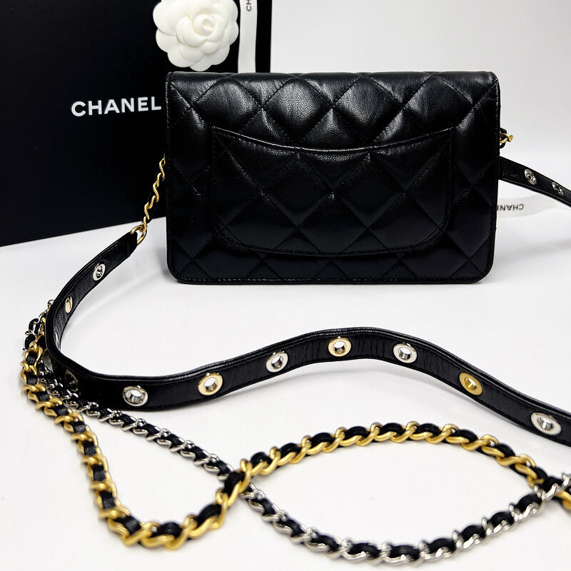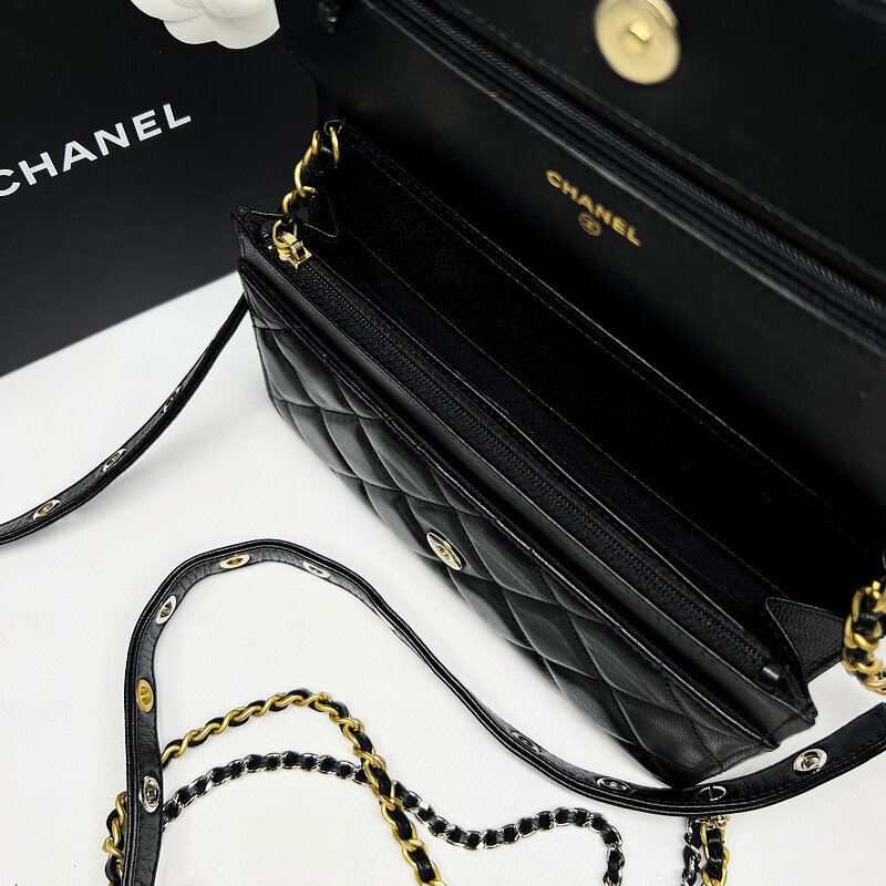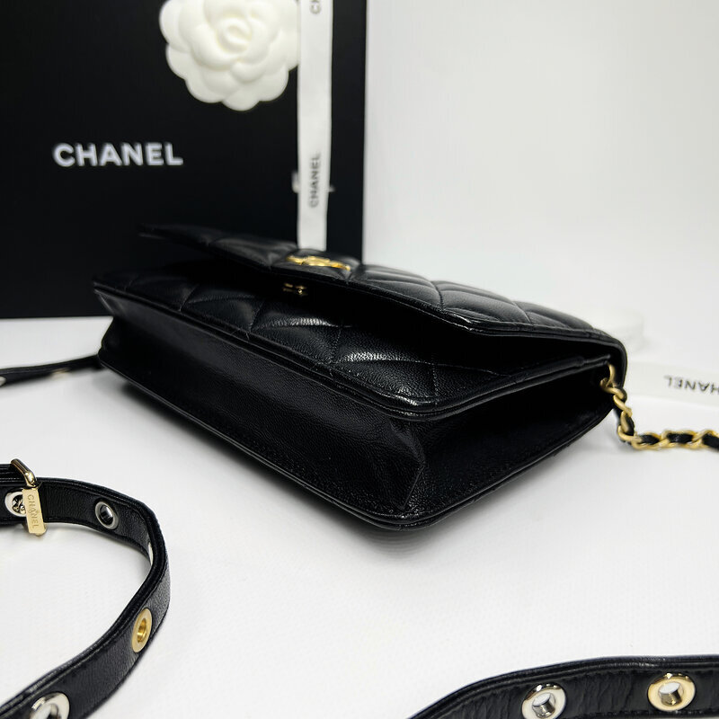 • Эта компактная модель выполнена из мягкой черной кожи с культовой ромбовидной стежкой Matelassé. Клапан украшен знаковой металлической пряжкой CC в оттенке «античное золото». Плечевой ремень сочетает классические цепи, переплетённые кожей, и широкий кожаный ремень с декоративными люверсами — аксессуар легко носить как кроссбоди или на плече, а при необходимости использовать как клатч.