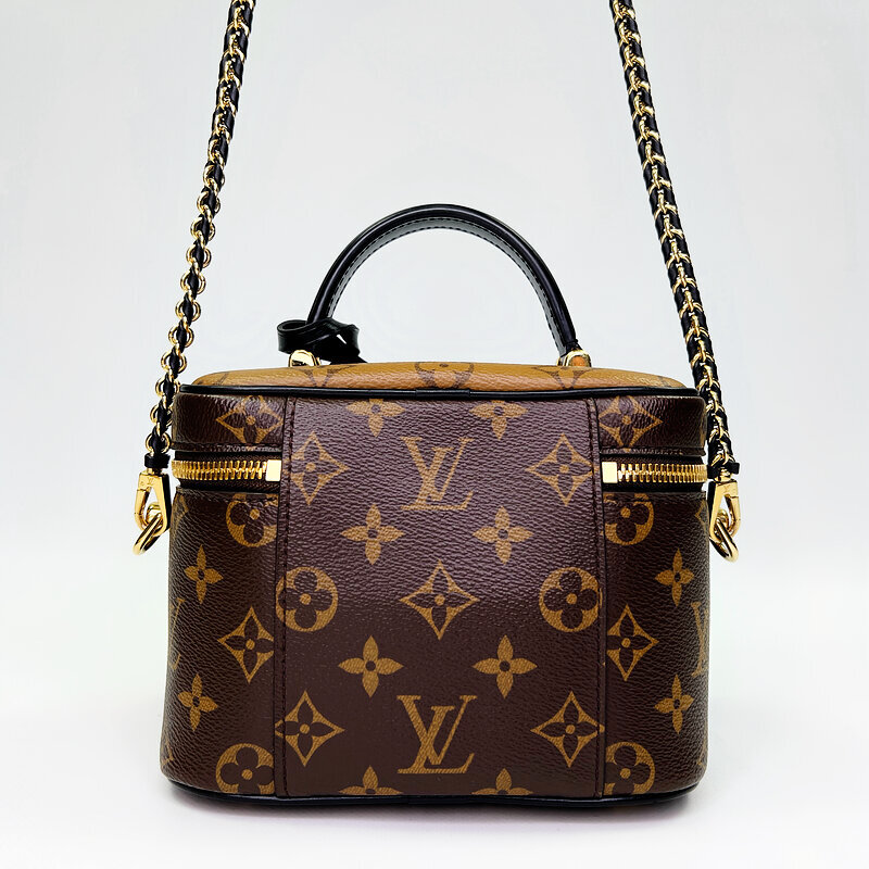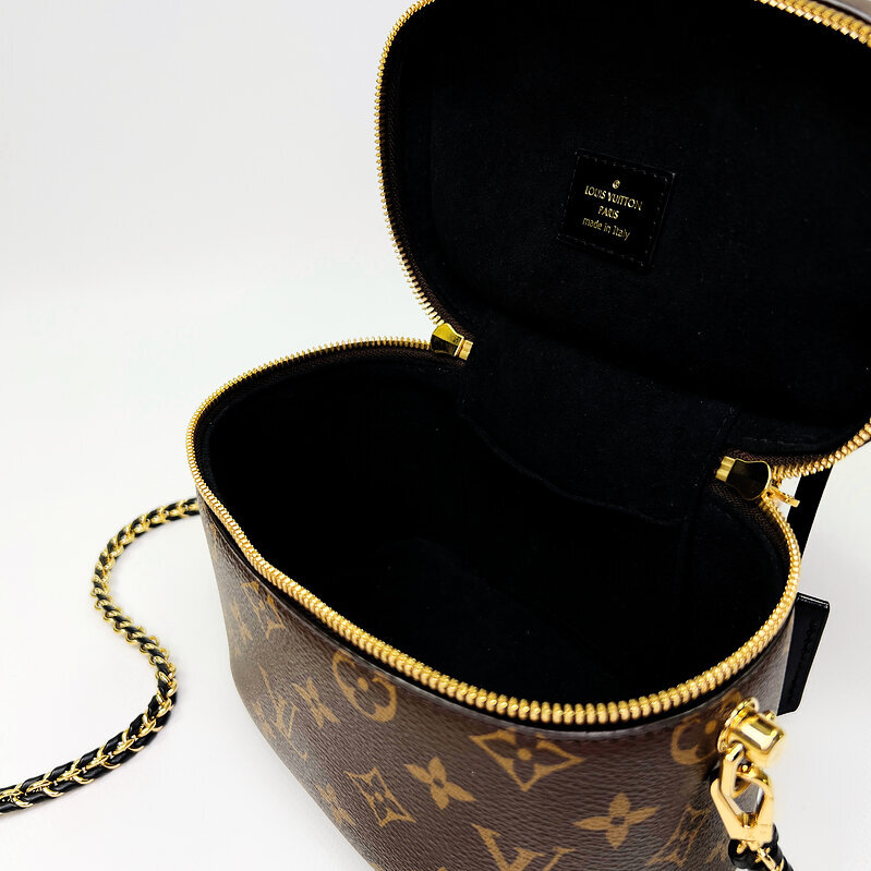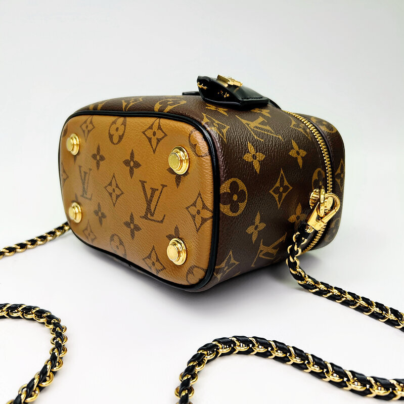 Компактная сумка-кейс в фирменном канве Monogram с кожаными элементами в чёрном цвете и фурнитурой в оттенке золота. Жёсткая форма подчёркивает архитектурность силуэта, а съёмный ремень-цепочка с кожаным плетением позволяет носить модель как на плече, так и кросс-боди. Практичный формат вмещает все необходимые аксессуары, сохраняя статусность и лёгкий винтажный шарм.