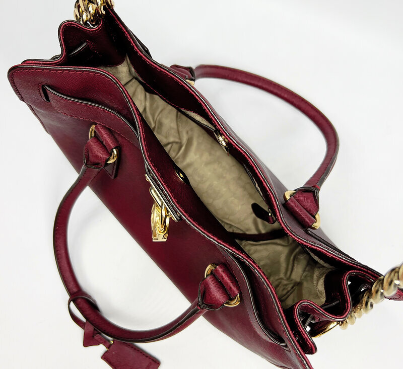 Выполнена из прочной фактурной кожи бордового оттенка и украшена фирменной золотистой фурнитурой с подвеской-замком MK. Две короткие ручки и плечевой ремень с цепочкой позволяют носить аксессуар в разных форматах. Внутри — удобное отделение с карманами для организации.