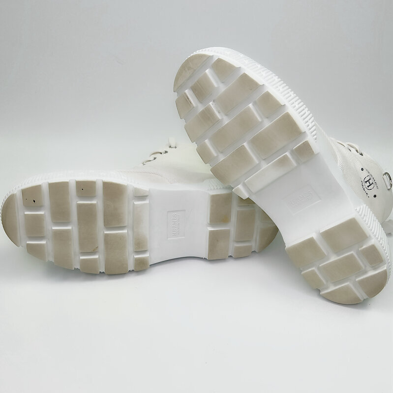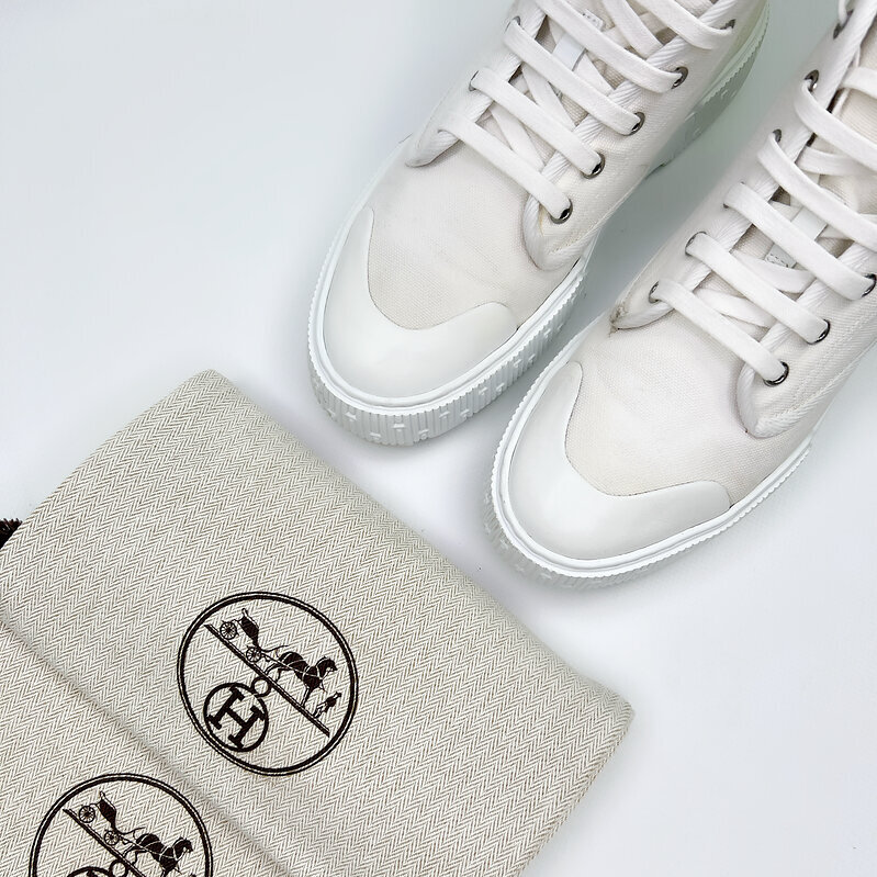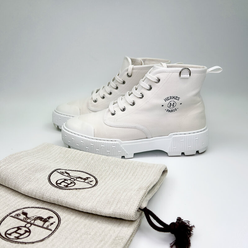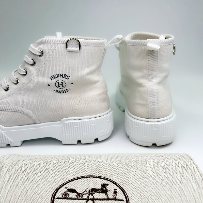 Выполнены из плотного светлого текстиля в благородном молочном оттенке. Минималистичный силуэт подчёркивает фирменная маркировка Hermès Paris и характерные детали бренда. Контрастная массивная подошва придаёт модели современный характер и делает её особенно выразительной.