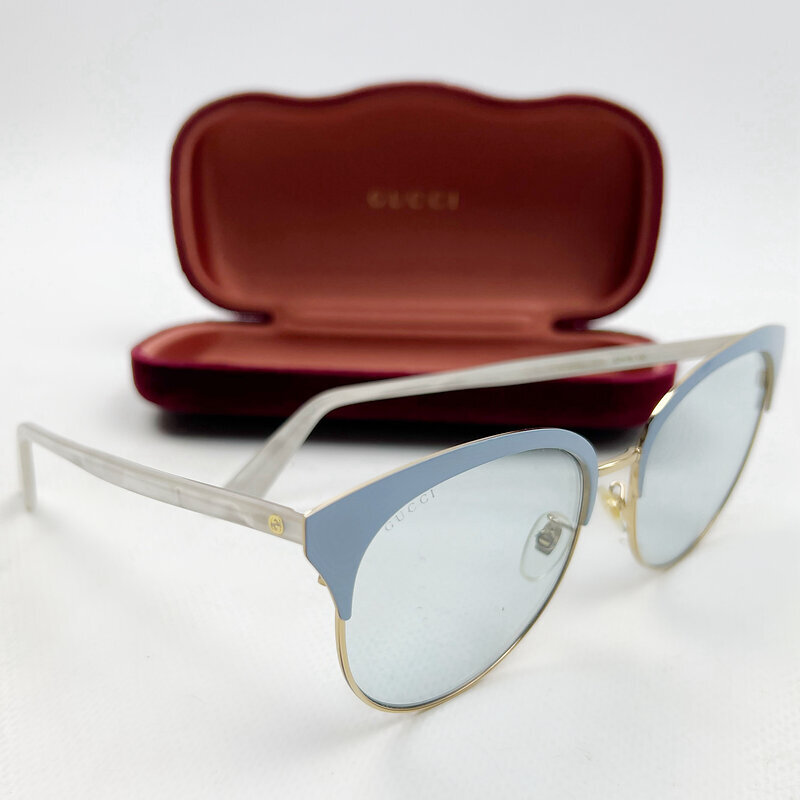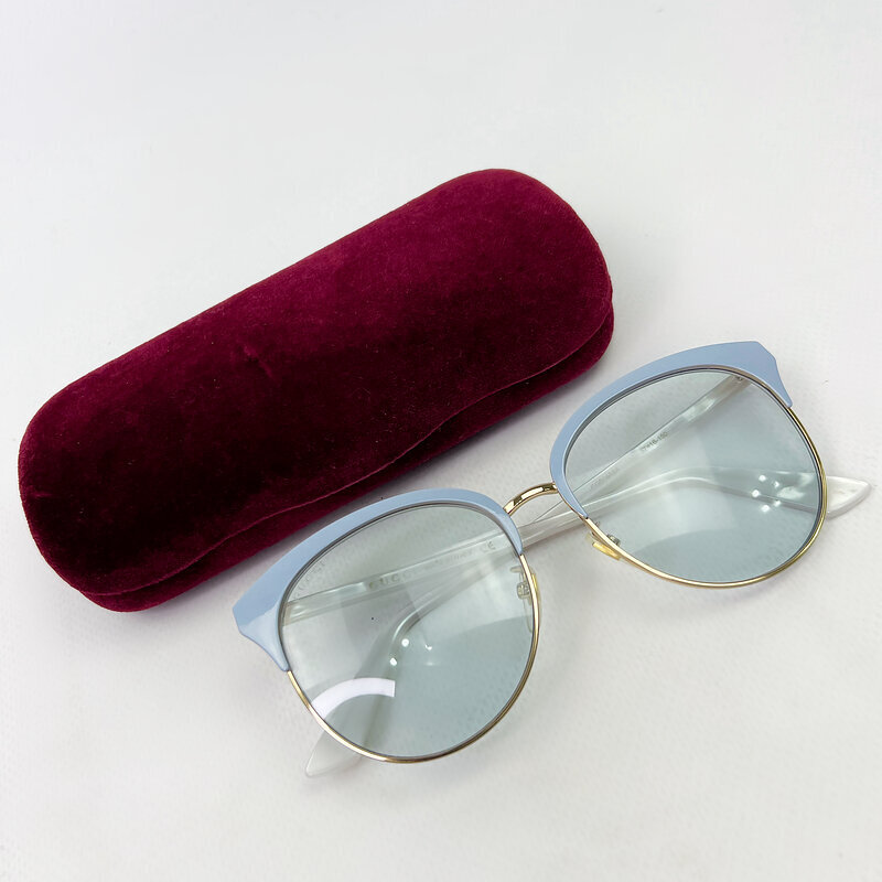 Модель от Gucci — это про лёгкость, свет и современную элегантность. Нежный голубой оттенок линз создаёт ощущение воздушности и добавляет образу свежести, делая аксессуар идеальным для весенне-летнего гардероба.