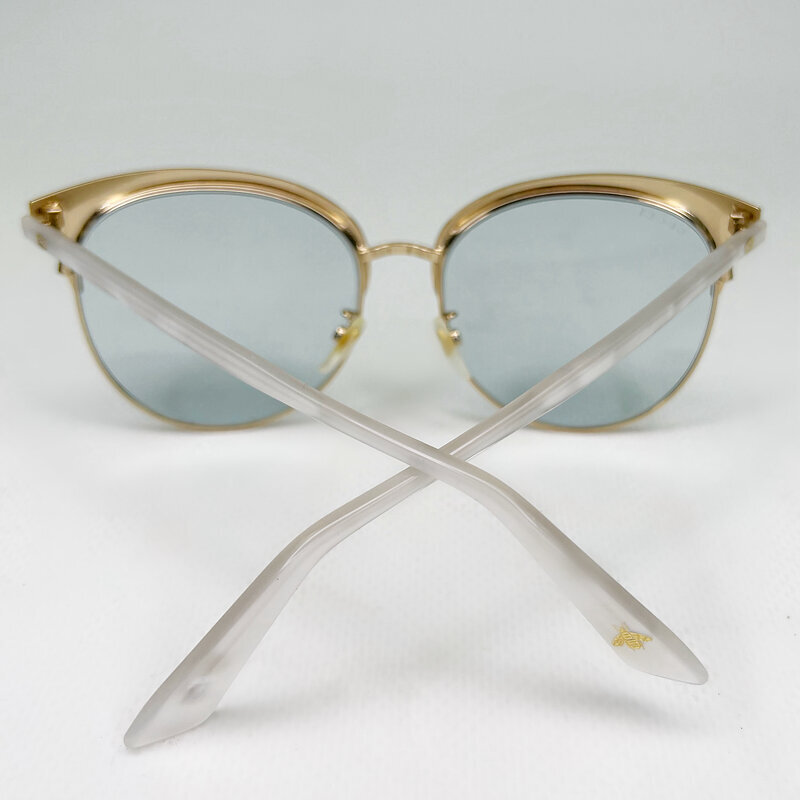 Тонкая золотистая оправа подчёркивает утончённость формы, а полупрозрачные дужки добавляют визуальной чистоты и современного звучания. Это баланс между ретро-настроением и актуальным минимализмом — очки, которые мягко выделяются, не перегружая образ.
